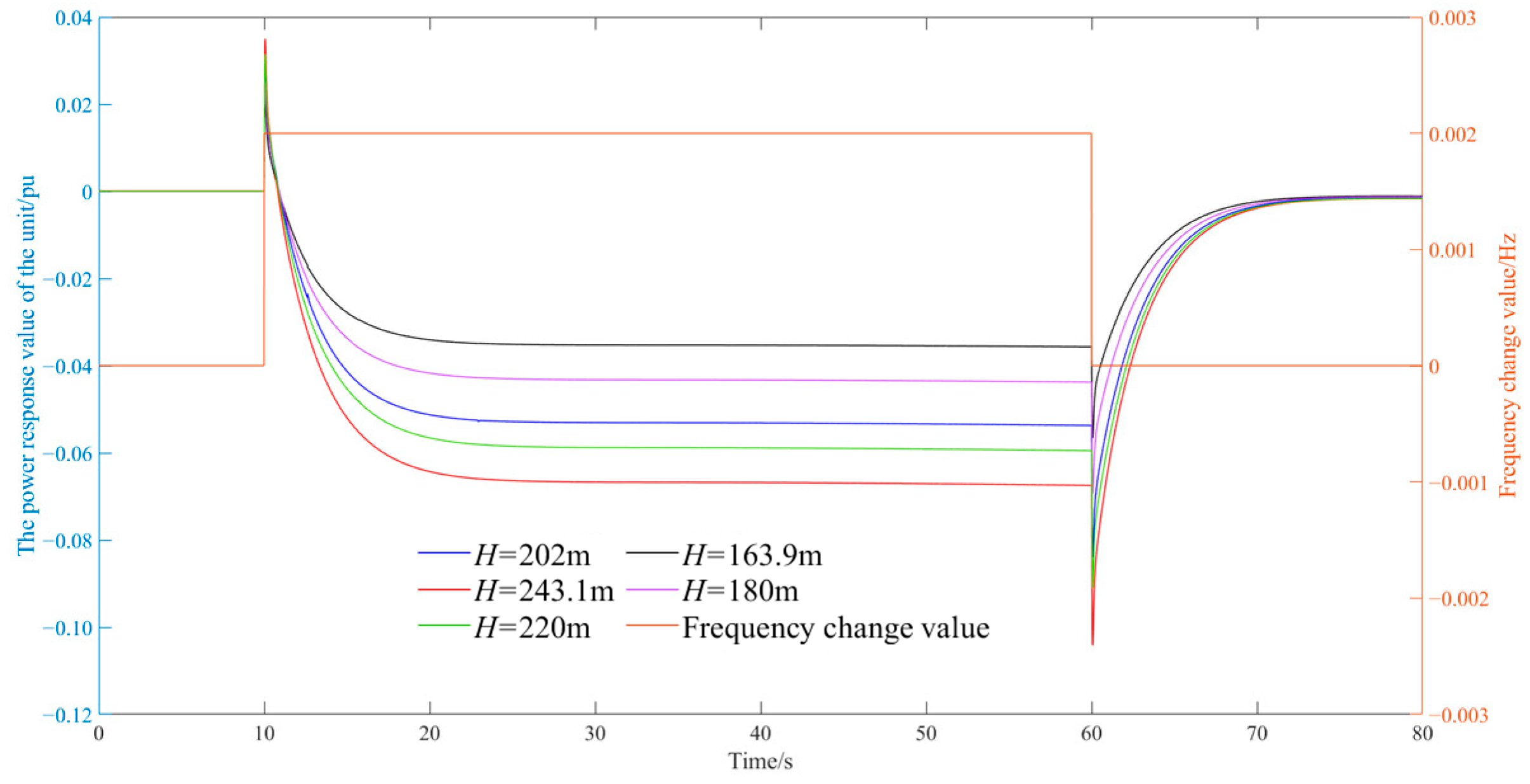 Frequency response process indicators of hydropower stations under different water heads.