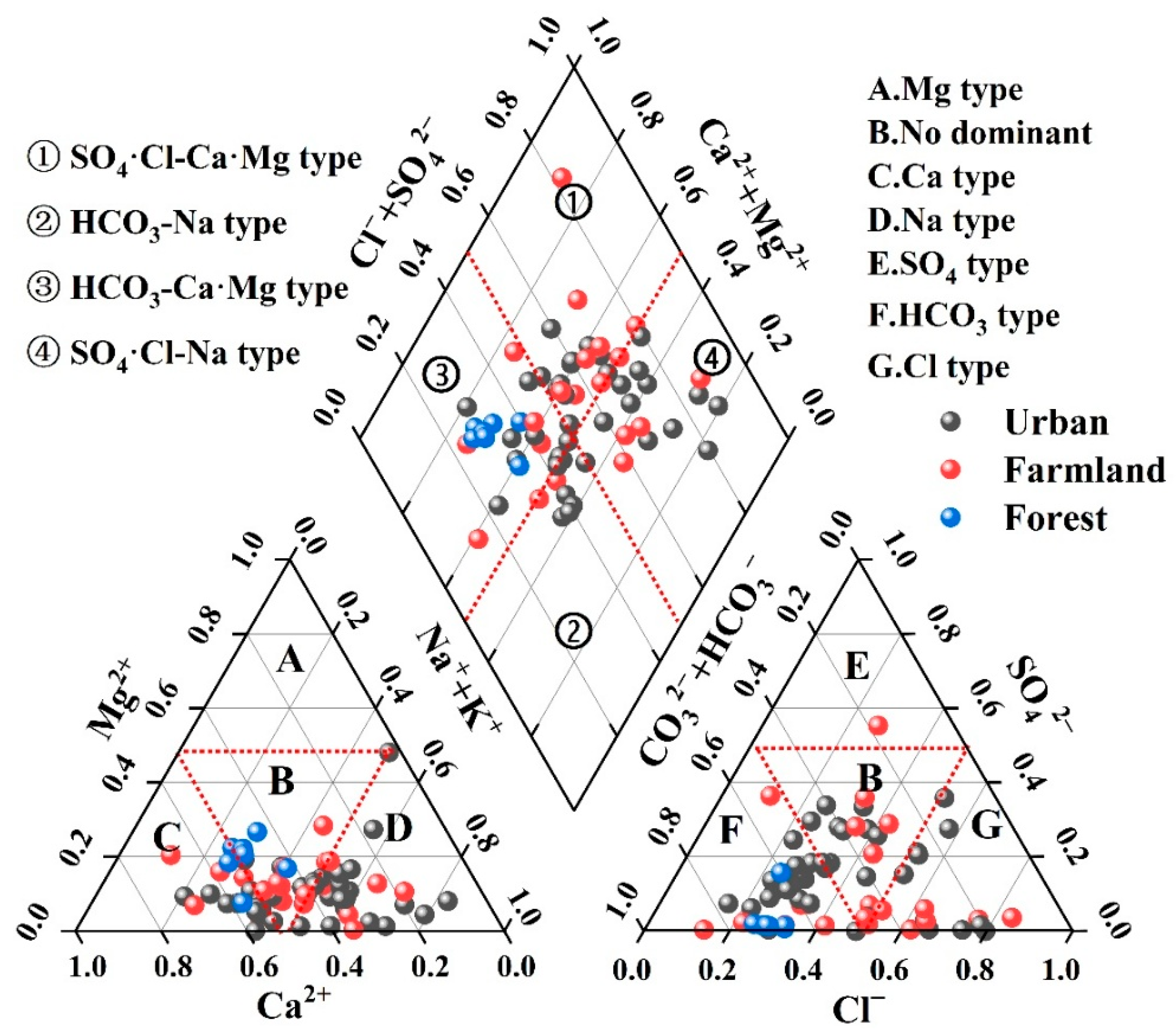 Table 1. Groundwater pH across the study area ranges from 4.24 to 7.31, with a mean of 6.08; 67.1% of the samples fall below the national Class III threshold (pH < 6.5), indicating a predominantly weakly acidic to neutral signature. Previous studies have found that the frequency of acid rain in the Shenzhen area is as high as 70%, with an average pH value of 4.25. Therefore, acidic precipitation could be an important reason for the low pH of groundwater [