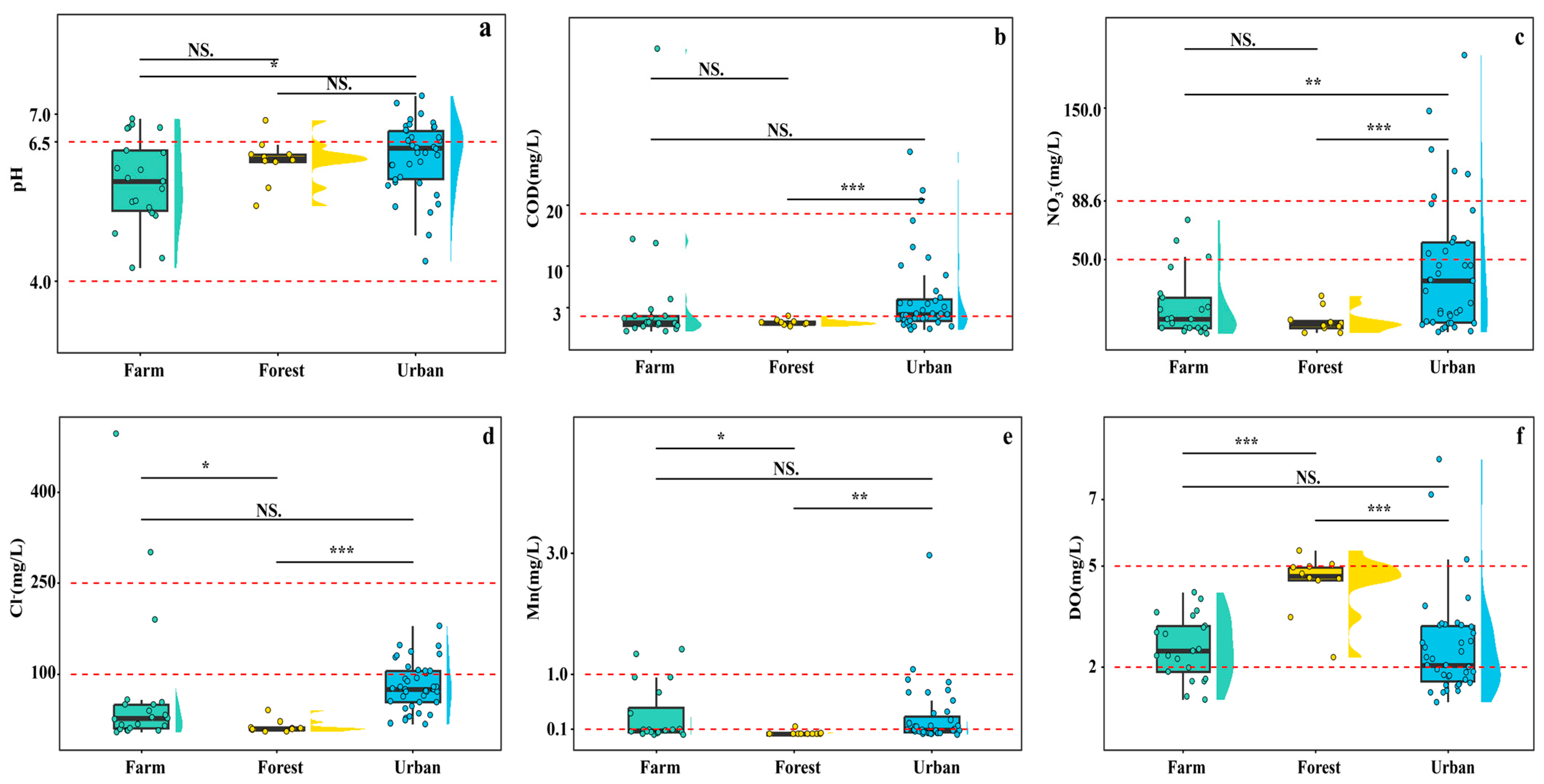 (1) The groundwater quality in highly urbanized areas shows a high exceedance rate of water quality parameters, with the exceedance rates of pH, NH4+, COD, Mn, and Fe being 67.1%, 44.3%, 44.3%, 34.3% and 31.4%, respectively. The Water Quality Index assessment revealed that 32.9% of the groundwater samples were classified as poor, underscoring the substantial impact of human activities on groundwater quality. Land-use types significantly affected groundwater quality; the concentration of COD, NO3−, Mn, and Fe in the urban areas were significantly higher than in the agricultural and forested areas.
