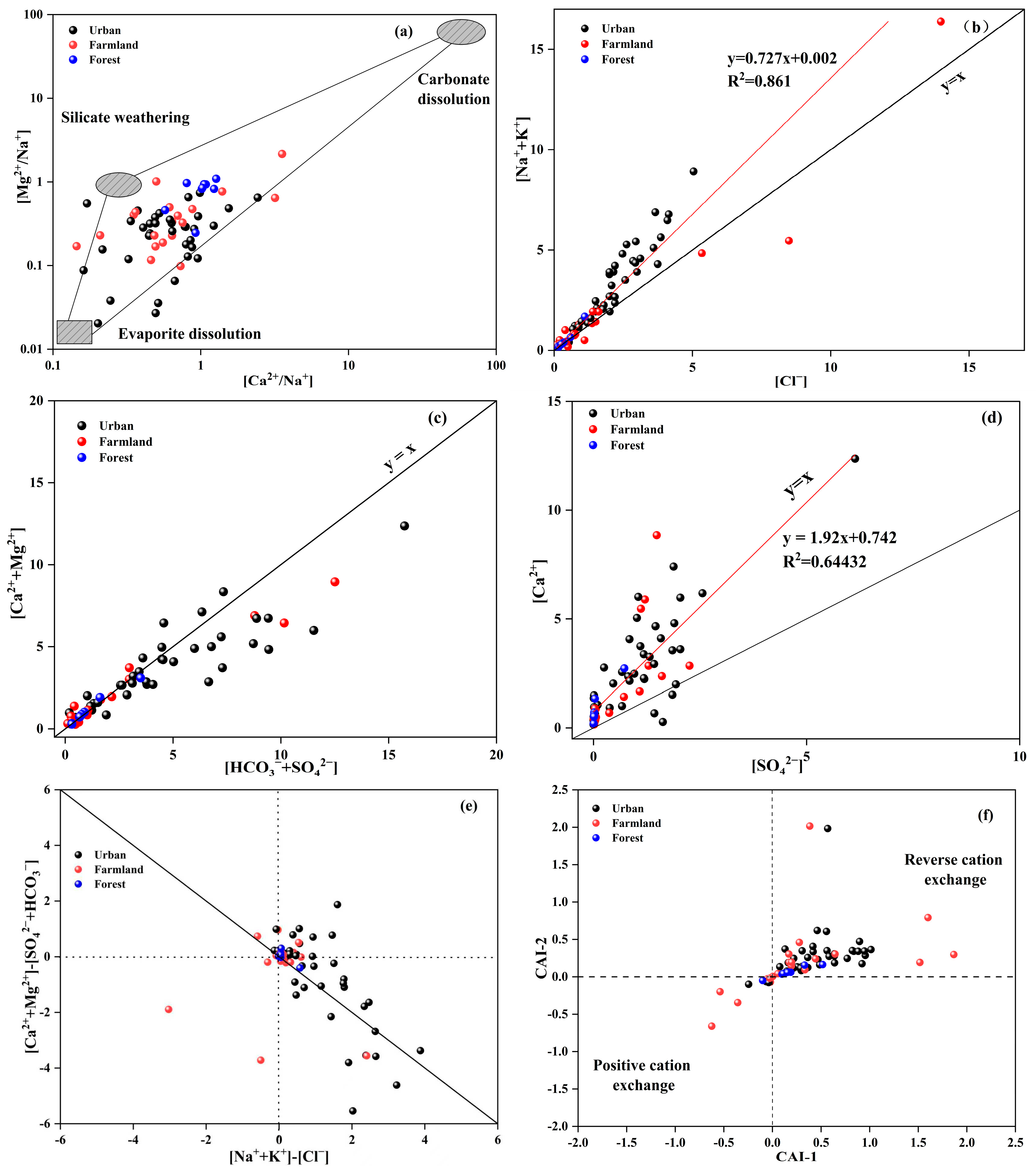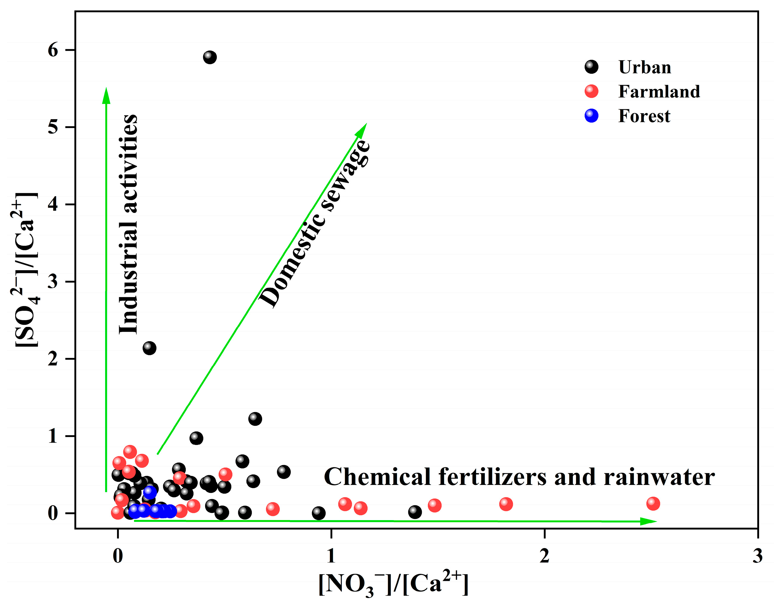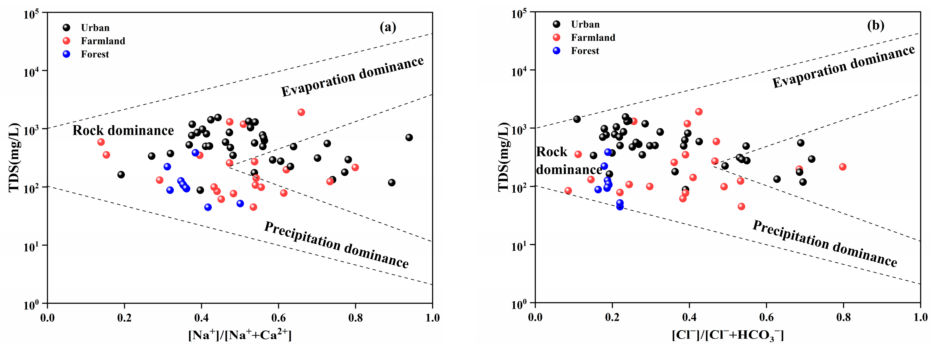 (2) Rock weathering is the primary control on the groundwater chemistry in the region, and human activities also have an important impact on the formation of groundwater chemistry. Among them, silicate weathering constitutes the principal source of Na+ and K+, while Ca2+, Mg2+ and HCO3− primarily originate from the dissolution of carbonate minerals. Moreover, the weathering and dissolution of evaporites are one of the main sources of SO42−. In addition, domestic sewage, industrial wastewater, and fertilizers are the main sources of NO3− in the groundwater of the region.