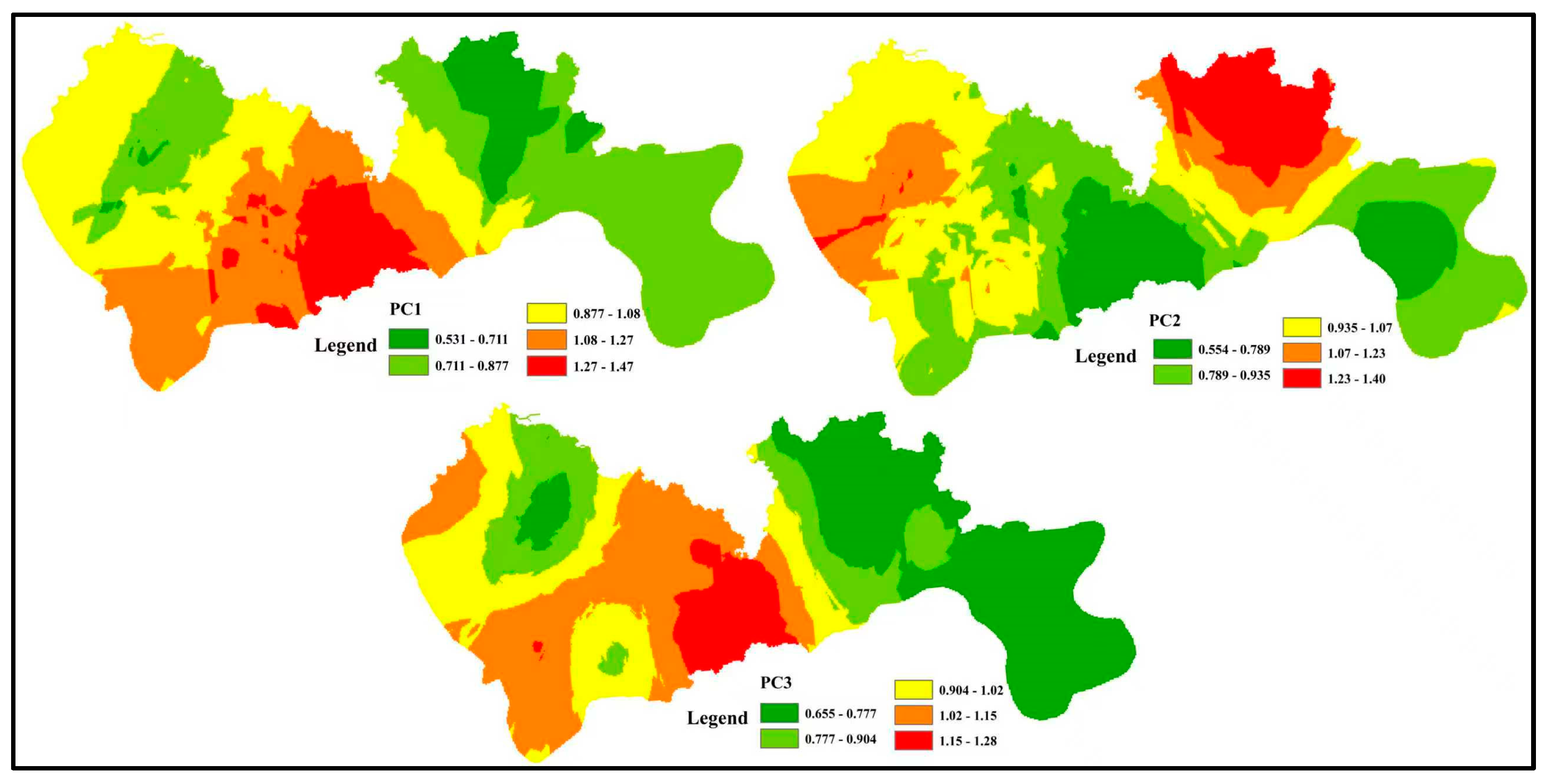 High PC1 scores are concentrated around the peripheral districts of the central metropolitan area, indicating severe impacts from domestic sewage and industrial effluence. These peri-urban zones are densely populated and host numerous small-scale factories that often lack wastewater-treatment facilities; consequently, uncontrolled discharge constitutes the principal threat to groundwater quality. Elevated PC2 scores occur mainly in the north-eastern and north-western parts of the study area, reflecting regions where water–rock interaction governs the hydrochemical signature. High PC3 scores are observed southeast of the city core, demonstrating that intensive agricultural activity—and associated fertilizer use—is the dominant driver of nitrate contamination in that sector.