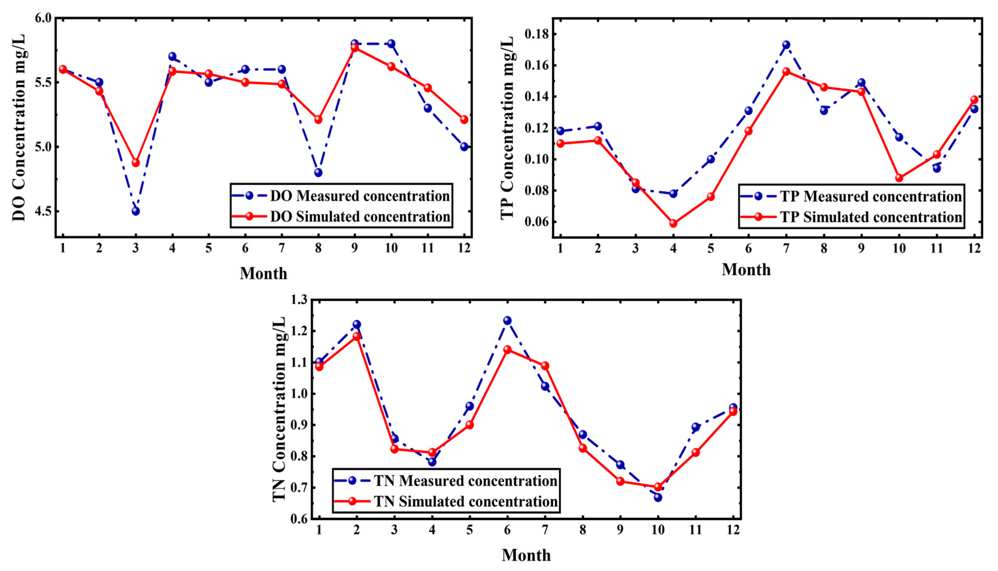 Water quality model calibration and validation | Jiashan Hydrological Bureau | Monthly Water Quality (DO, TN, TP) | Year 2022–Year 2023 | MIKE 21 ECO Lab Module |