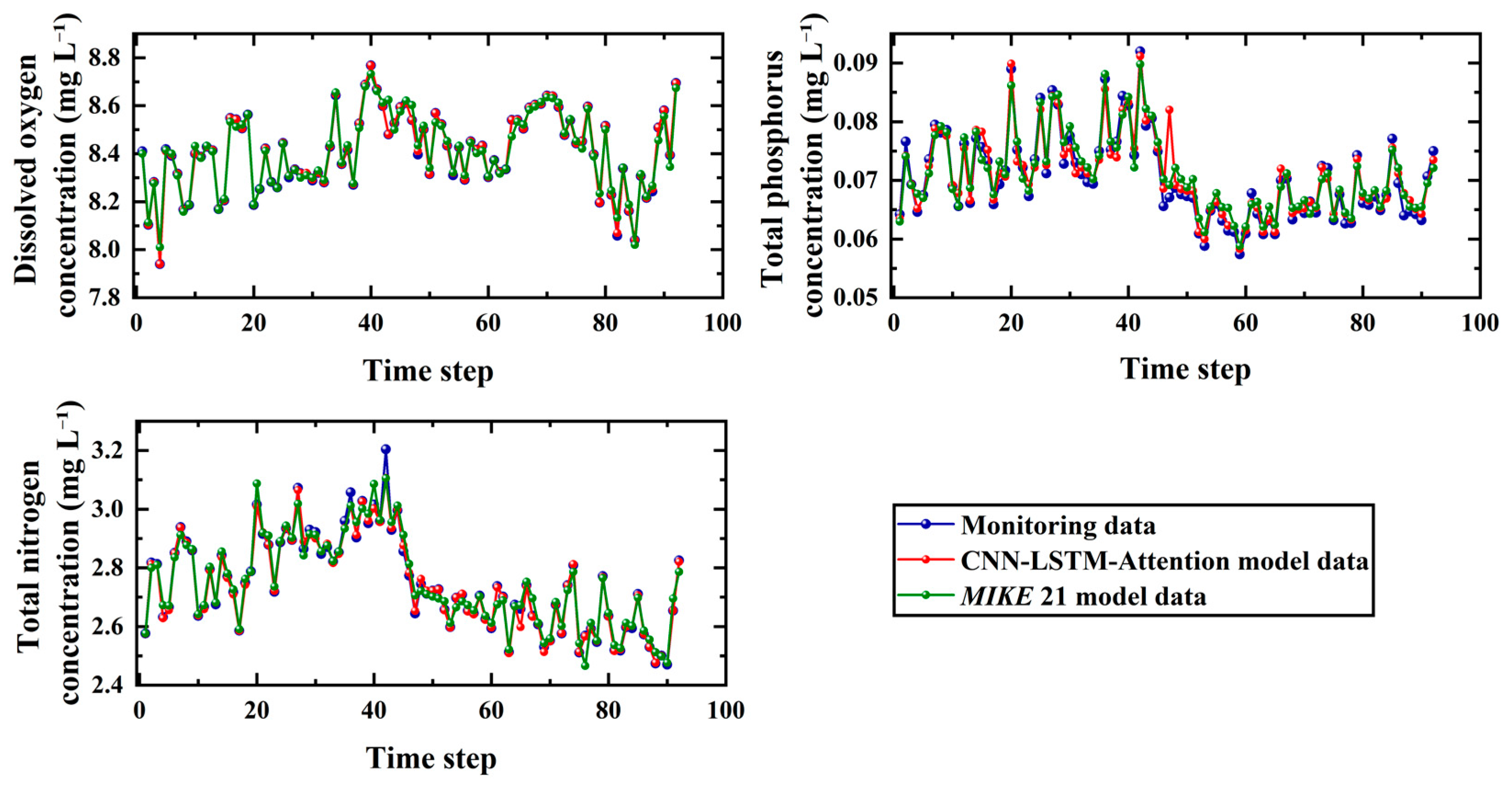 Comparative analysis of both models | Field Monitoring data | Daily Water Quality (DO, TN, TP) | October–December 2023 | MIKE 21 and CNN-LSTM-Attention Models |