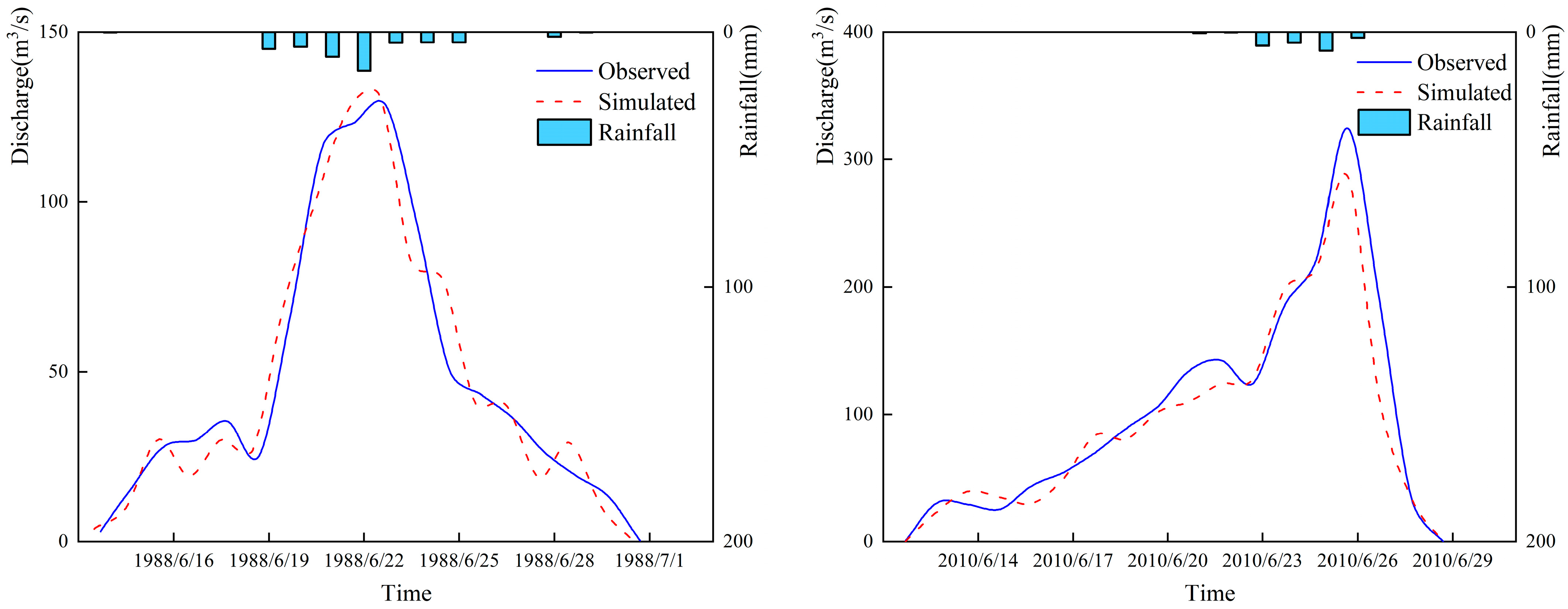SGF runoff depth error was only −14.47% to 13.30%. Similarly, Tian conducted flood simulation in the Guanshan River Basin using the HEC-HMS model and obtained a peak discharge error of 15% [