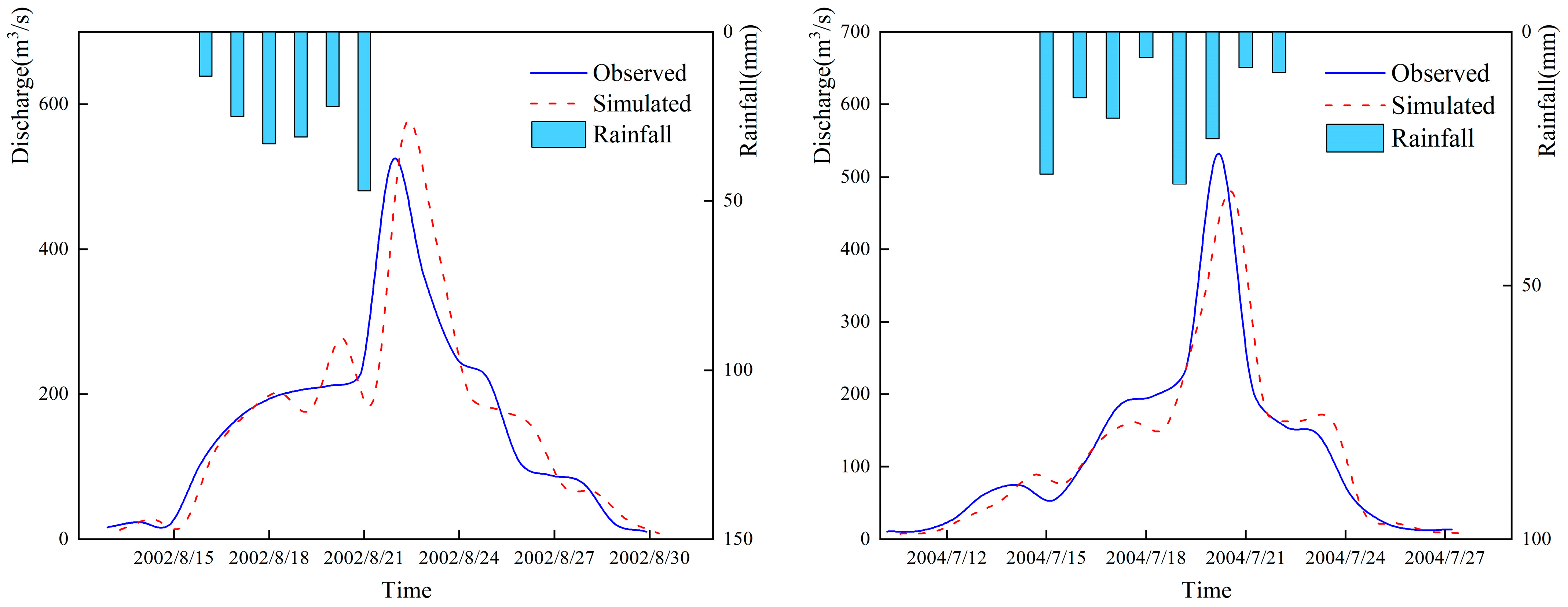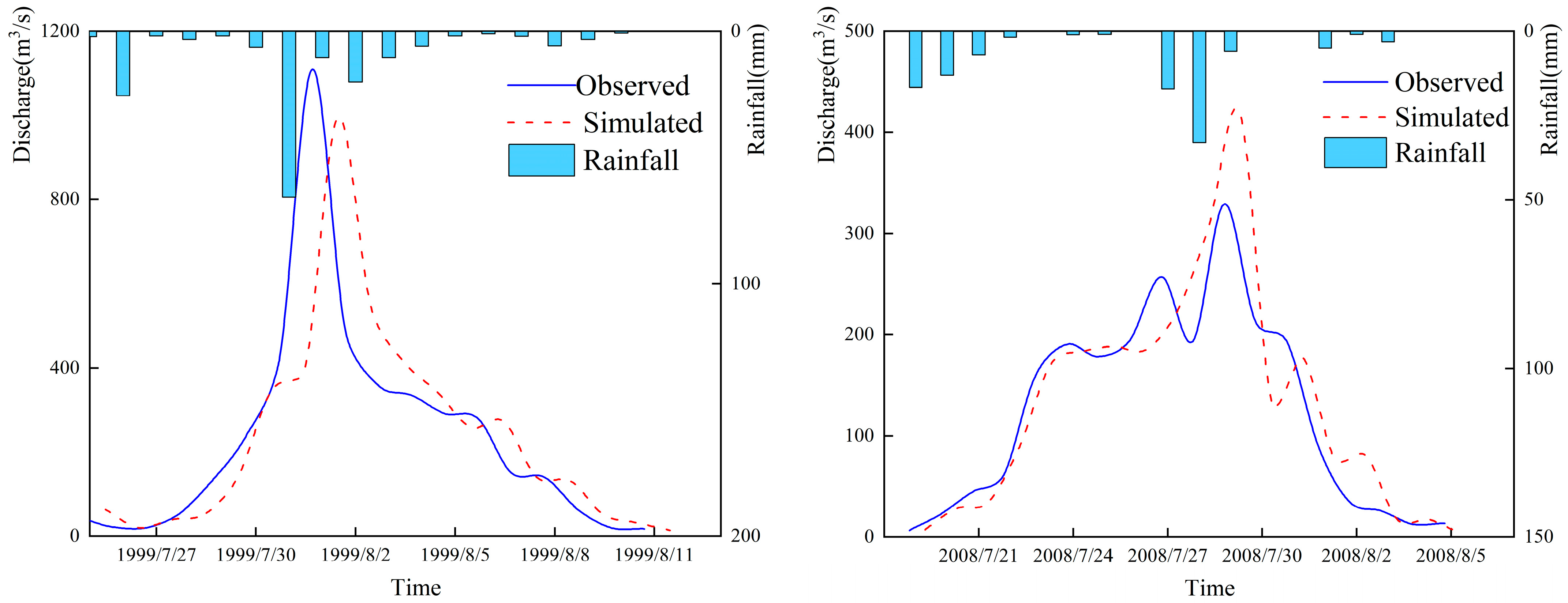 NSE) of 0.82 during the validation period, with flood peak error ranging from −19.20% to 18.16% and peak time error < 2.7 h (