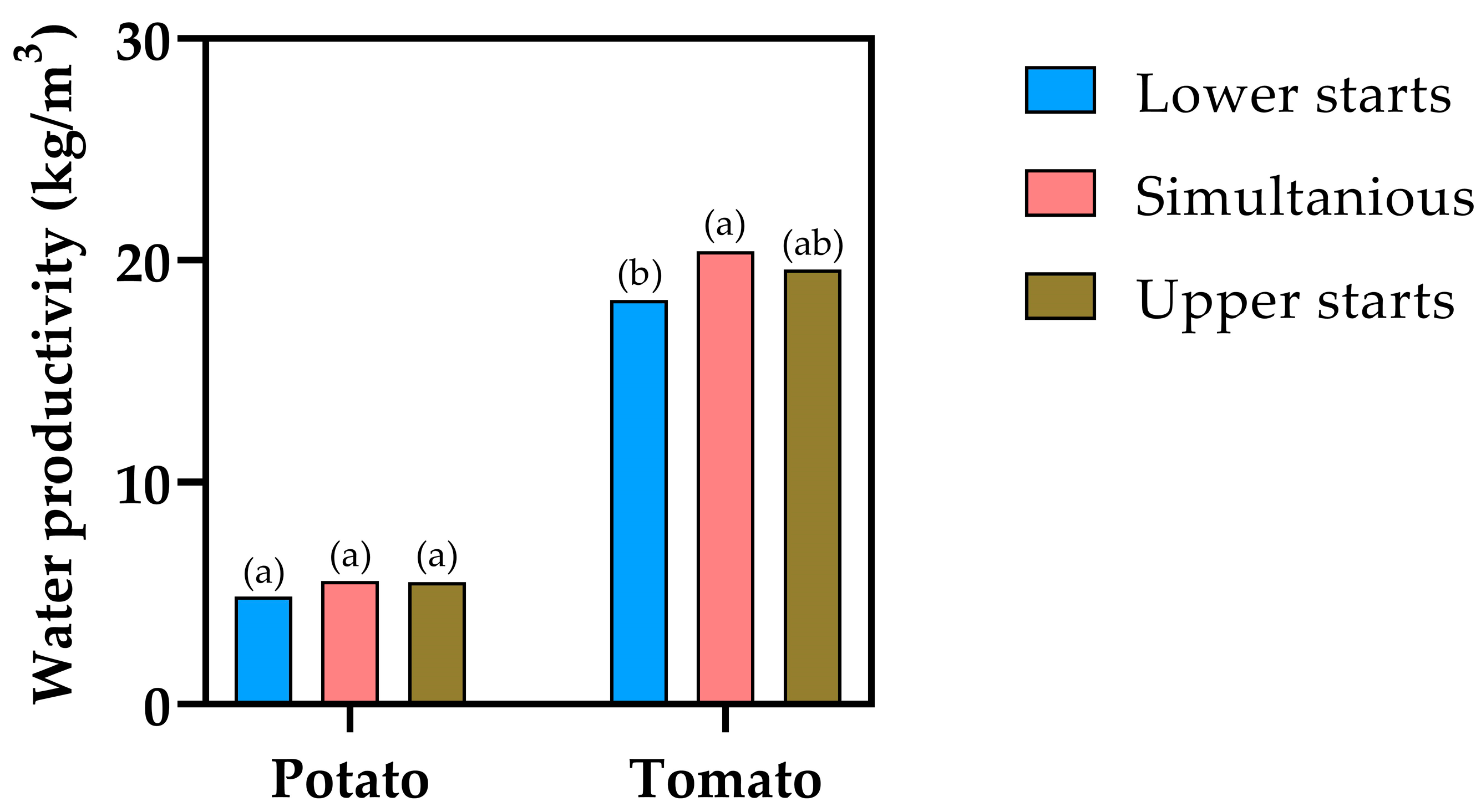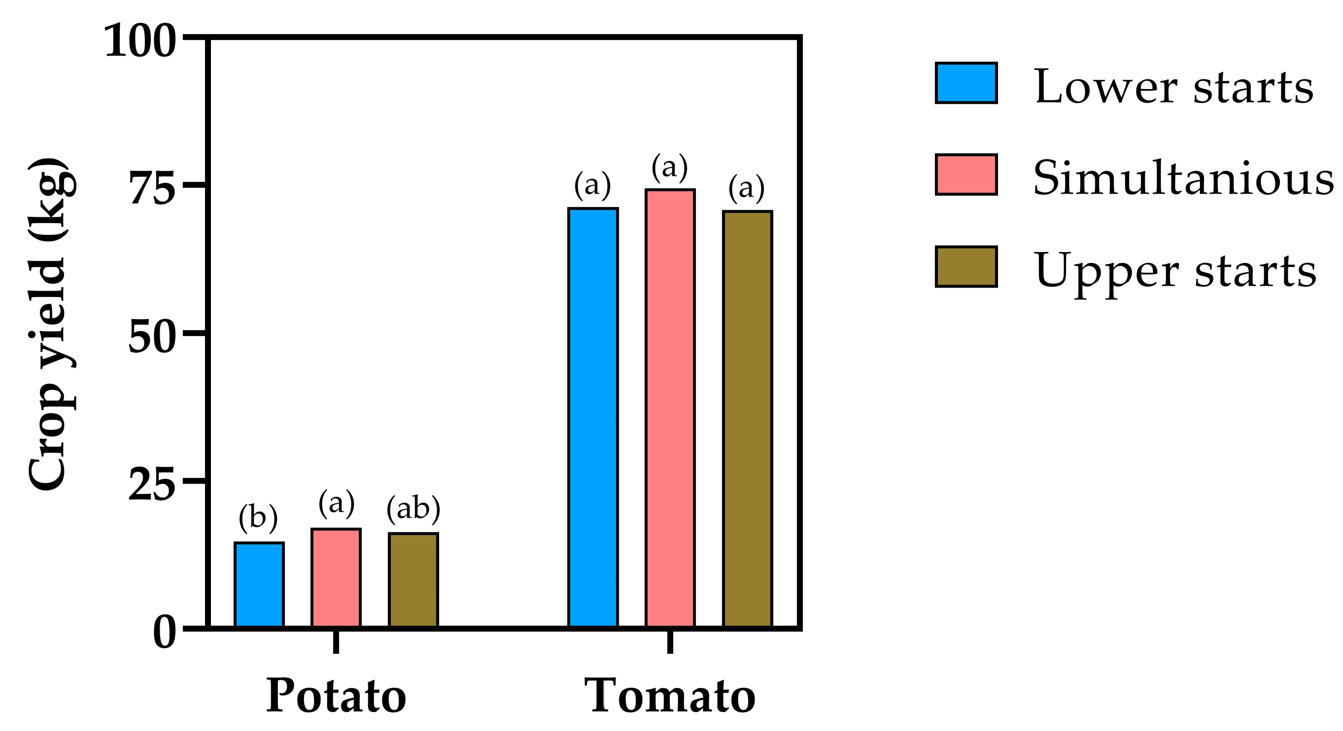 Potatoes | Both | Avg. Yield per plant (g/plant) | ** | 944.91 (a) | 840.69 (b) | * | 819.32 (b) | 949.66 (a) | 909.42 (ab) |