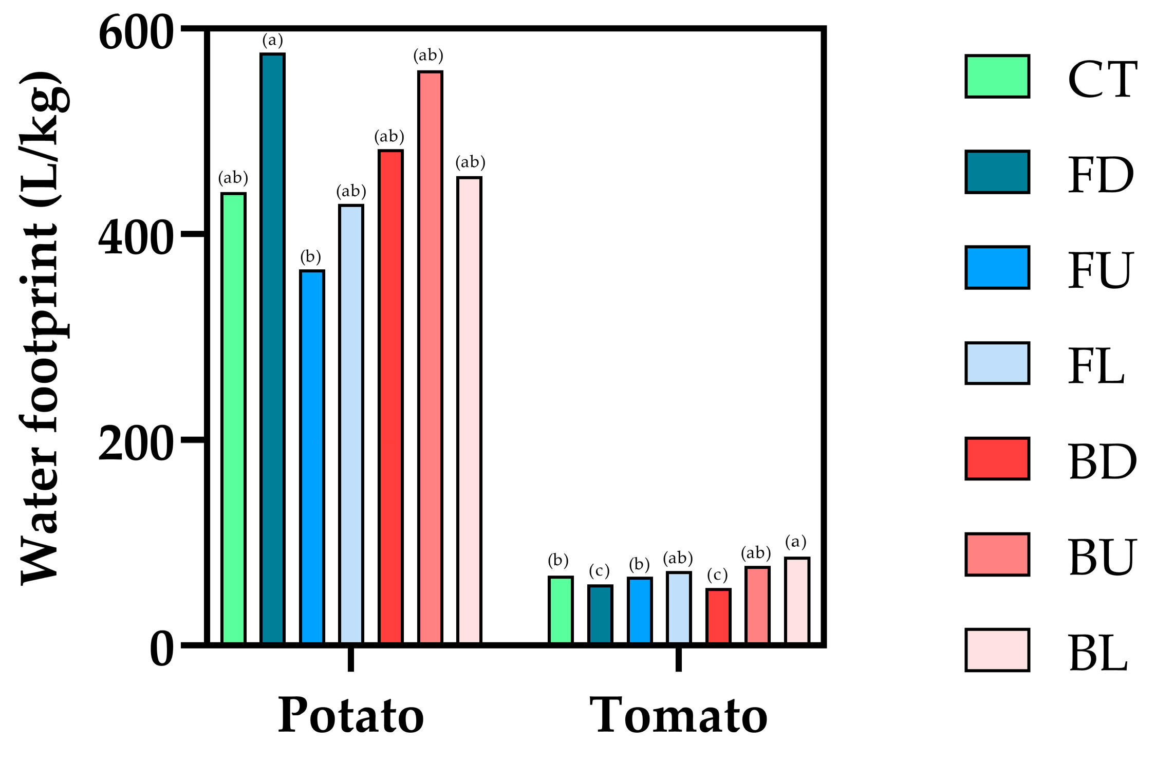 Potatoes | Fruits dry weight (g) | ** | 40.29 (b) | 63.46 (a) | 39.96 (b) | 32.60 (b) | 36.50 (b) | 34.54 (b) | 35.00 (b) |