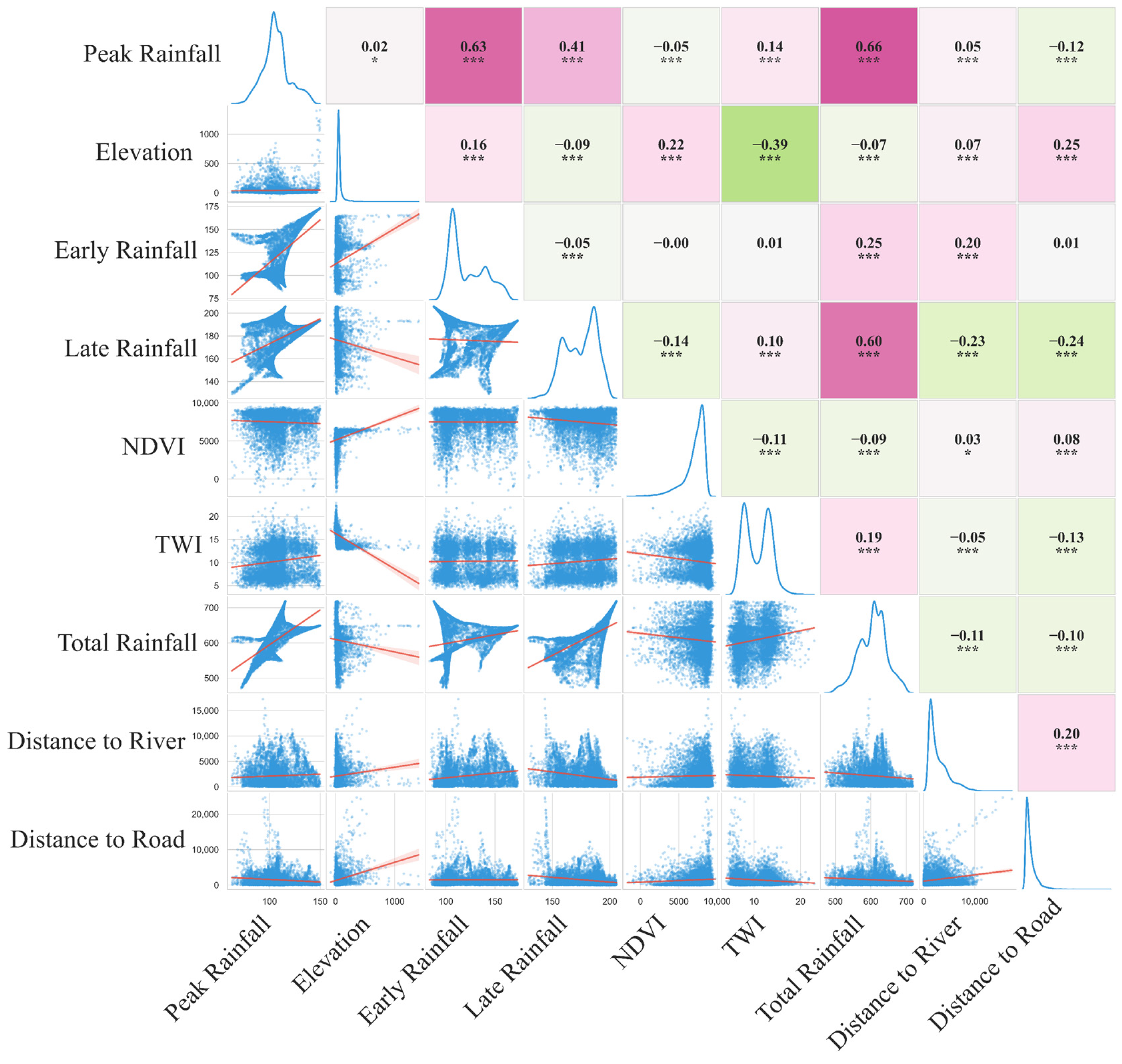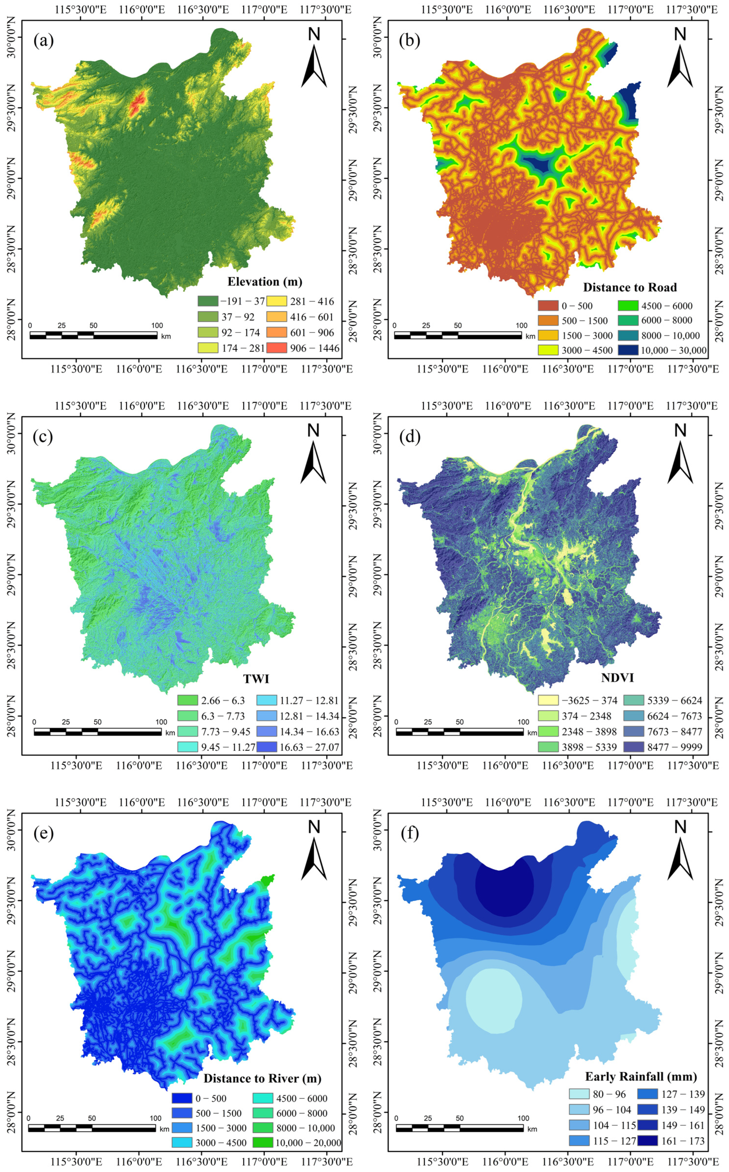- Geographic Spatial Database Construction: First, based on Sentinel-1 SAR and optical imagery with multiple temporal dimensions, flood inundation areas were manually interpreted and converted into 3720 flood point data points. An equal number of non-flood points were randomly generated in non-inundated areas to form the model training dataset. Next, using data from multiple sources (DEM, precipitation, geology, remote sensing, etc.), 20 preliminary environmental factors were calculated and extracted, including terrain, hydrology, meteorology, and other geological and human activity indicators. Finally, all data underwent unified geospatial registration and resampling processing.