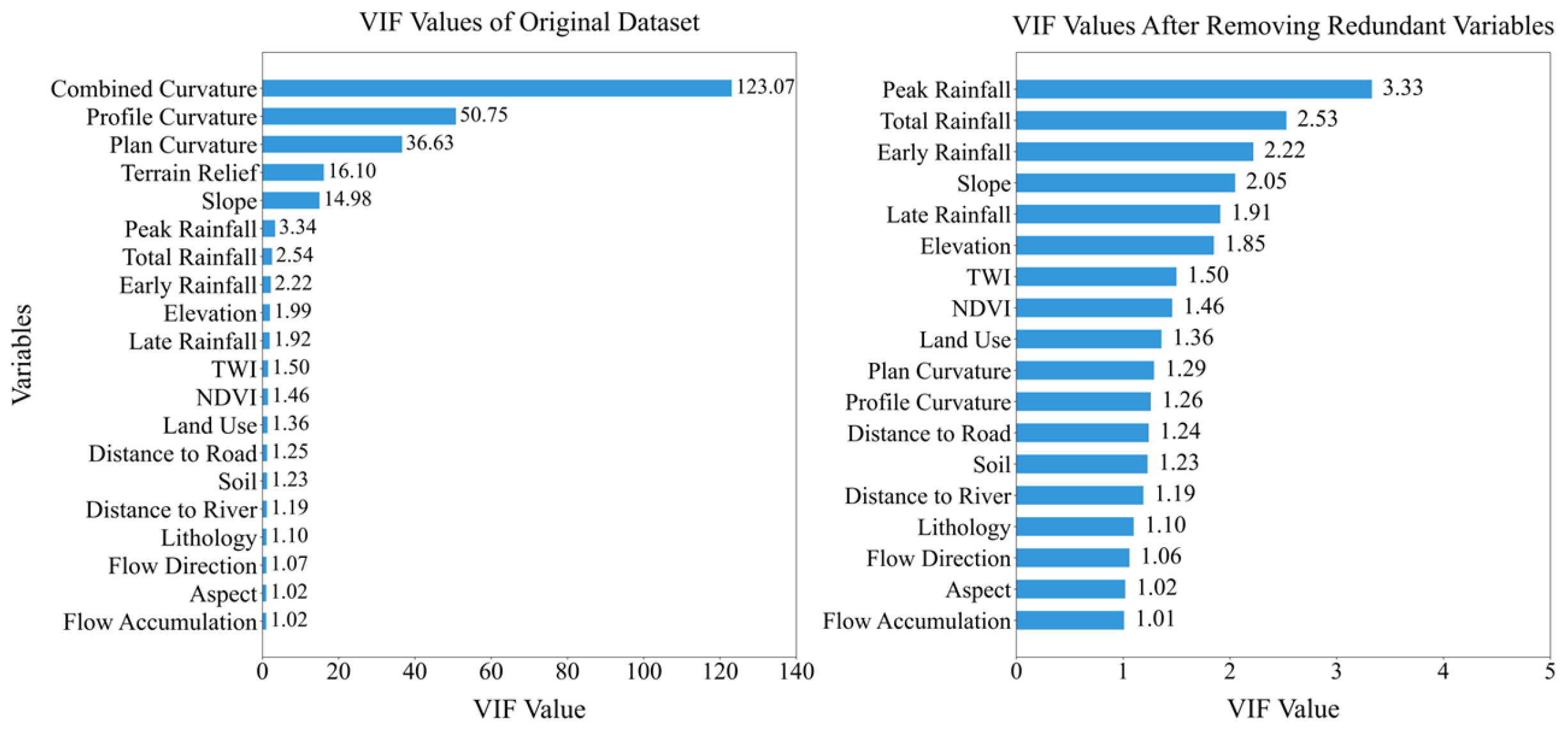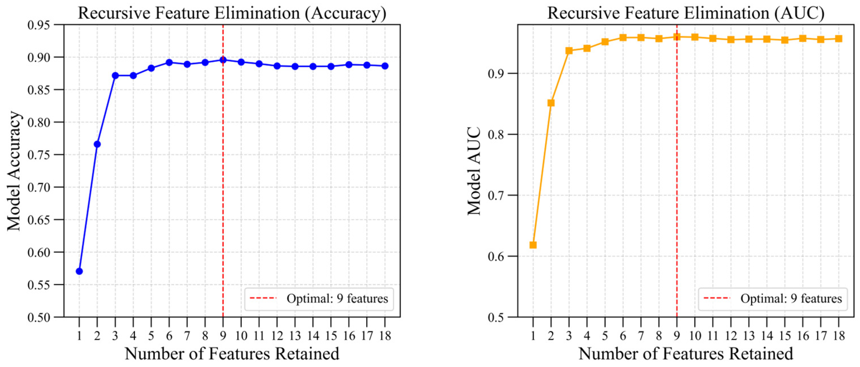 - Feature Selection and Optimization: To eliminate multicollinearity and screen out core driving factors, this paper uses VIF to perform a quantitative analysis of the initial factors, with VIF > 10 as the criterion for determining the existence of severe collinearity [46], through an iterative process, factors with the highest VIF values are eliminated until all remaining factors have VIF values ≤ 5. To further avoid overfitting in subsequent models, the Recursive Feature Elimination (RFE) method is used to select key factors based on the purified factor set [47]. By iteratively evaluating the contribution of features to the explanatory power of the model, features with low contribution to the model are gradually removed, and the optimal feature subset is ultimately retained for subsequent modeling.