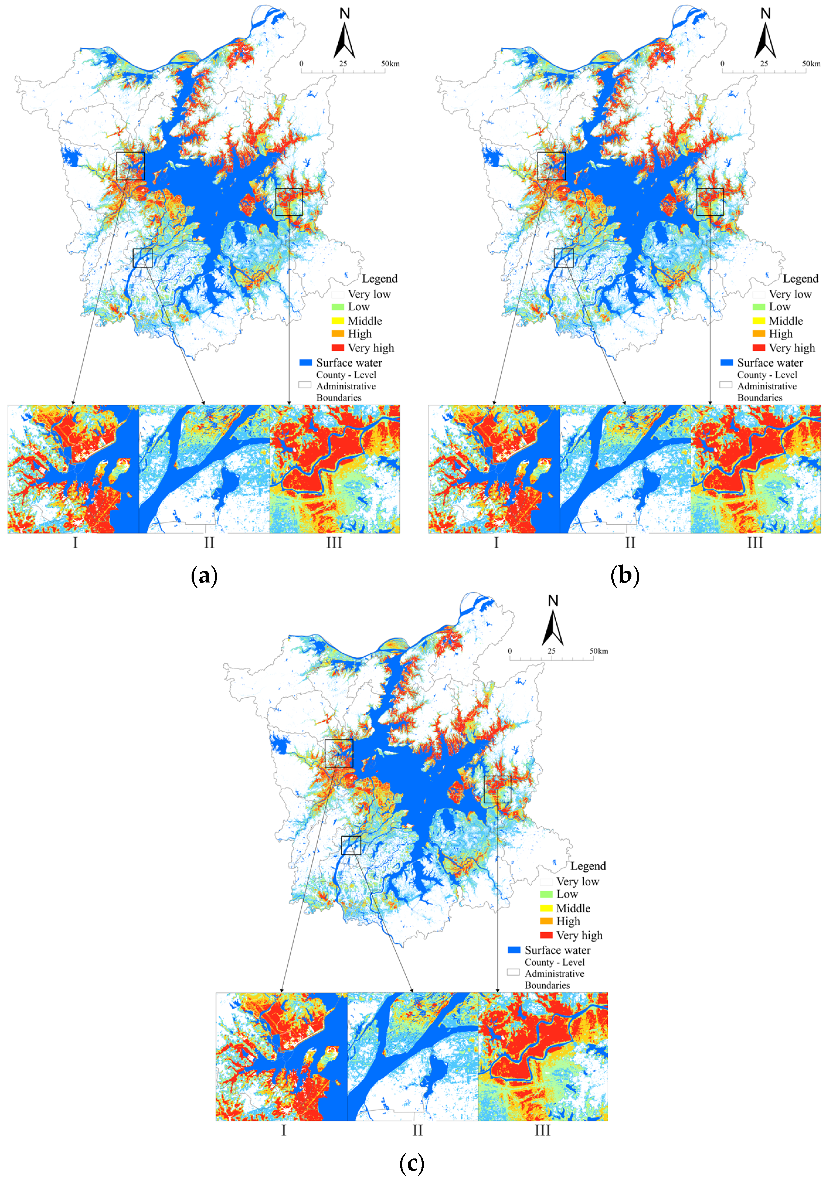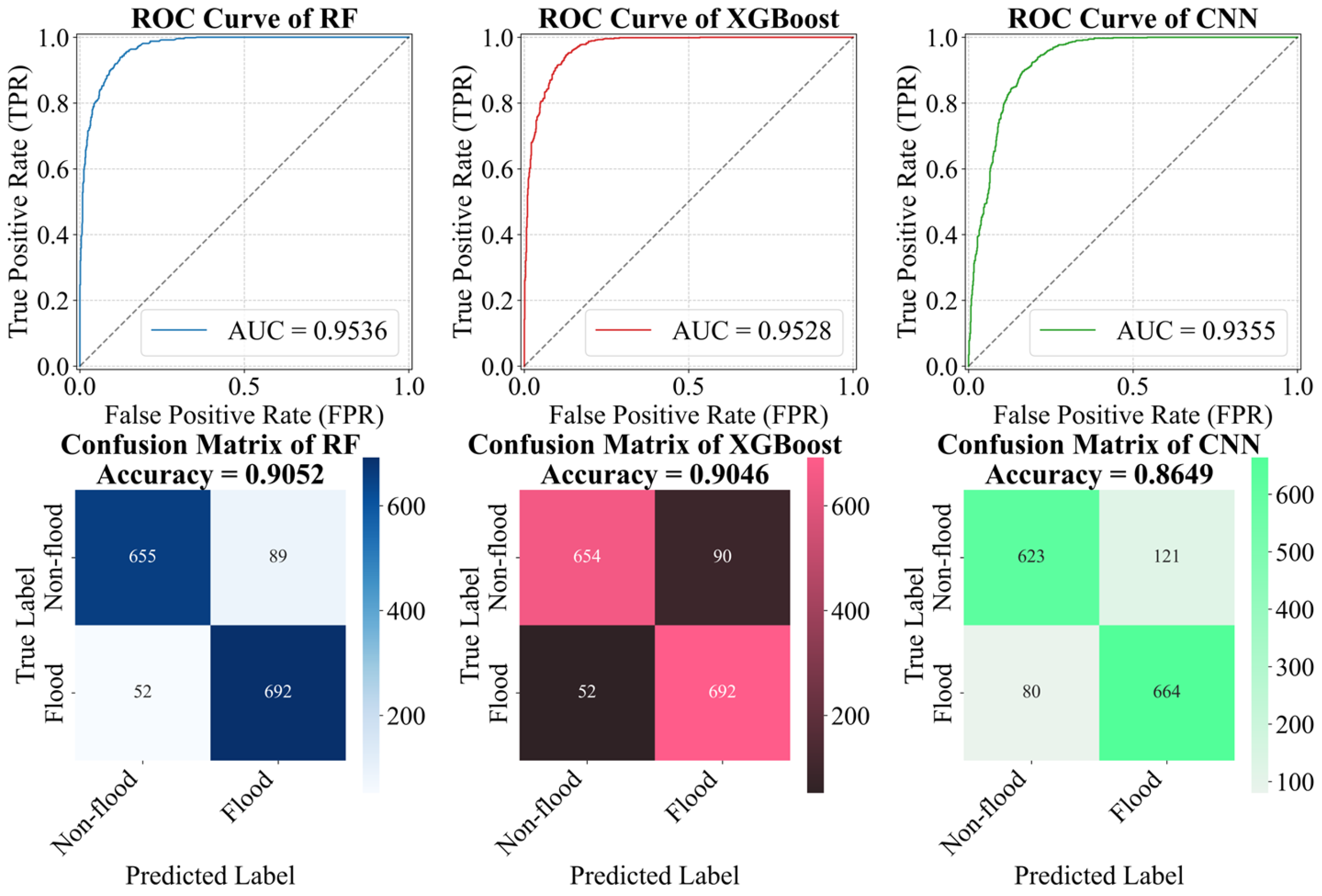 - RF and XGBoost outperformed the CNN model in the application of FSM in this study area. The RF model achieved the highest prediction accuracy (AUC = 0.9536), effectively capturing the spatial heterogeneity of risk driven primarily by microtopography and demonstrating the greatest applicability to this region. This finding provides a critical empirical benchmark for model selection in complex, human-modified river–lake systems, suggesting that models based on tree ensembles are more adept at handling their disrupted spatial patterns than deep learning models designed for coherent image data.