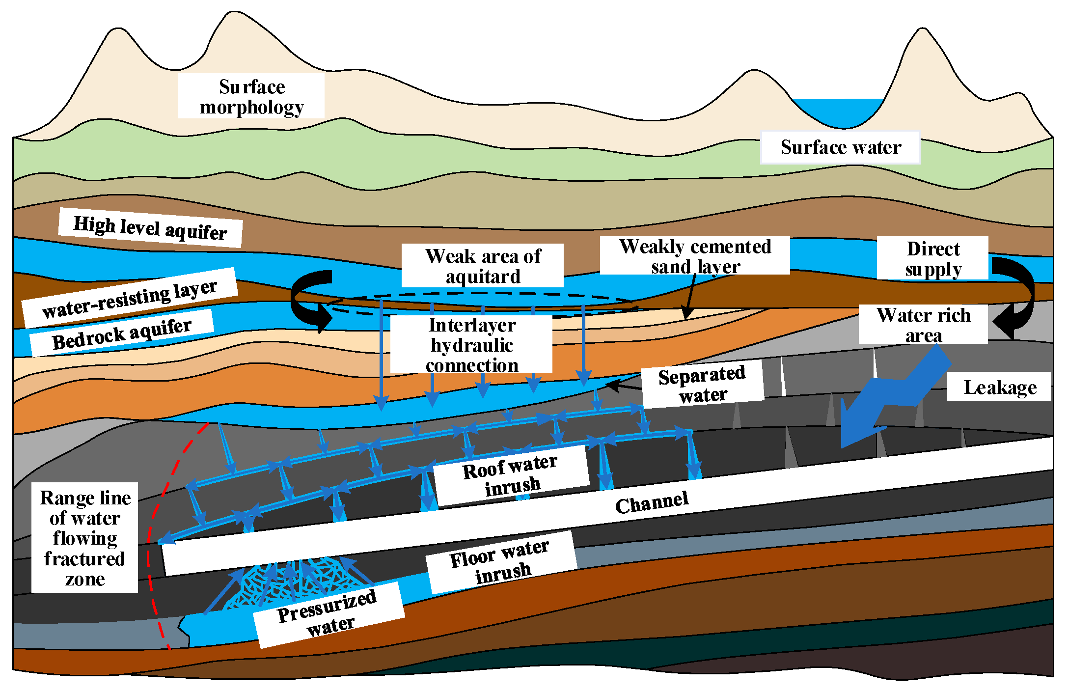 - Ma, D.; Duan, H.; Zhang, J.; Bai, H. A state-of-the-art review on rock seepage mechanism of water inrush disaster in coal mines. Int. J. Coal. Sci. Technol. 2022, 9, 50. [Google Scholar] [CrossRef]