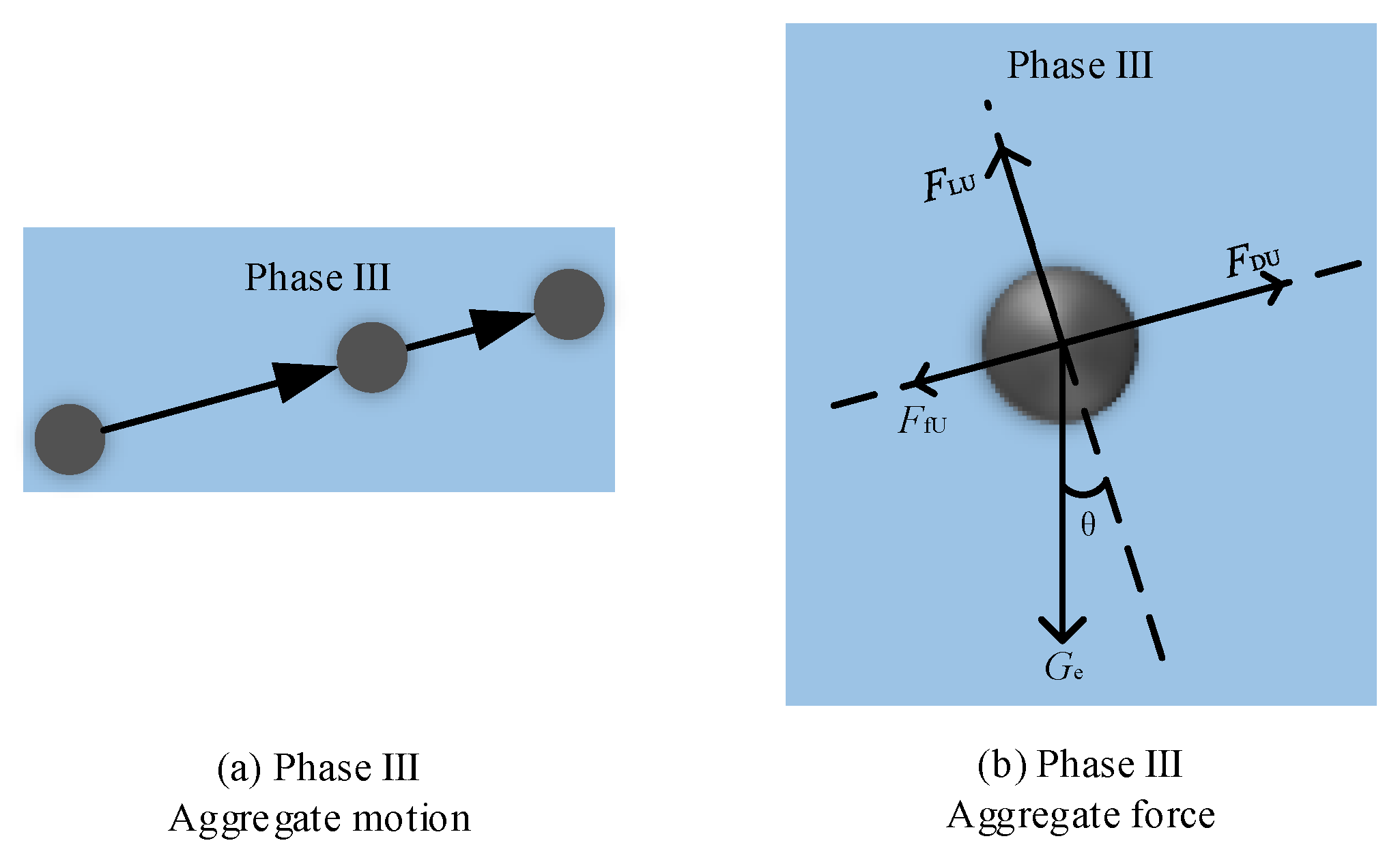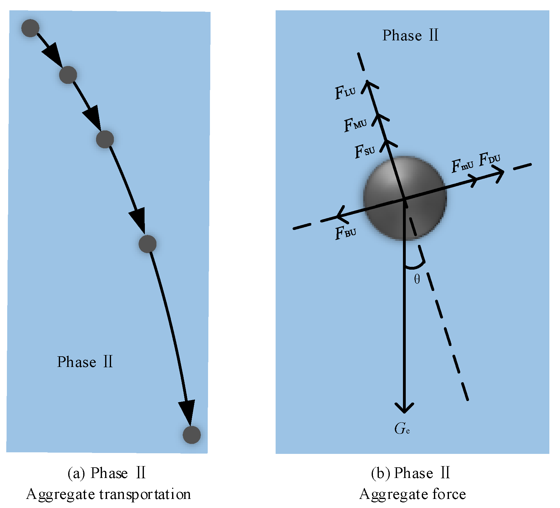 - The stage-by-stage force analysis of individual aggregate established a theoretical model for describing its motion path, with a derived formula for its displacement distance (along and vertically to the roadway). Then, the aggregate volume concentration Sv was introduced to modify this formula, so that it can also be applied to the aggregate particle group. The model’s error (compared with the numerical simulations) was within 10%. Parameter analysis showed that the aggregate density/size and the water gush roadway dip angle were negatively correlated with aggregate displacement distances in phase II and III, while the roadway height and current velocity were positively correlated—consistent with simulations.