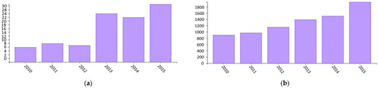 Number of scientific publications related to flood risk research between 2010 and 2015: (a) in Romania, (b) globally.