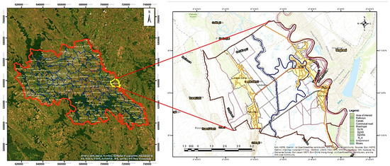 Location of the study area: the administrative borders of Iași County with the study area highlighted in yellow (left), and an overview map of the study area (right).