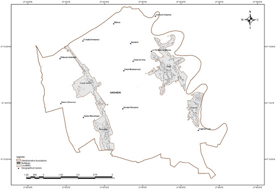 The study area is located in Ungheni, a locality situated in the eastern part of Iași county, at a distance of 21 km from the municipality of Iași (Romania), on the road from Iași to Chisinau (Figure 3). In the eastern part, the locality is bordered by the Prut River, which separates it from the town of Ungheni in the Republic of Moldova. It borders Golăești locality to the north, Țuțora locality to the south, the Republic of Moldova to the east, and Holboca locality to the west. The name originates from “unghi,” which means “angle” in Romanian, and refers to the fact that the town of Ungheni is situated at a bend in the Prut River [25]. It is also part of the Iași metropolitan area, where major infrastructure projects are being planned to connect the infrastructure networks of Romania and the Republic of Moldova, including the gas pipeline, the bridge over the Prut River, the A8 motorway, and other elements linking to the existing infrastructure. These investments will enhance the development of the area from all perspectives, including urban development, which requires an early assessment of risks, such as flooding, given the presence of two significant rivers in the area: the Prut River and the Jijia River. The flood risk on the Prut River has been modeled and evaluated according to EU Directive 2007/60/EC and is published online for public use/consultation (www.inundatii.ro) [47]. In this study, the flood hazard for the area surrounding the Jijia River is evaluated, optimizing the use of geospatial data by reusing and updating it from other new data sources.