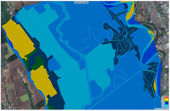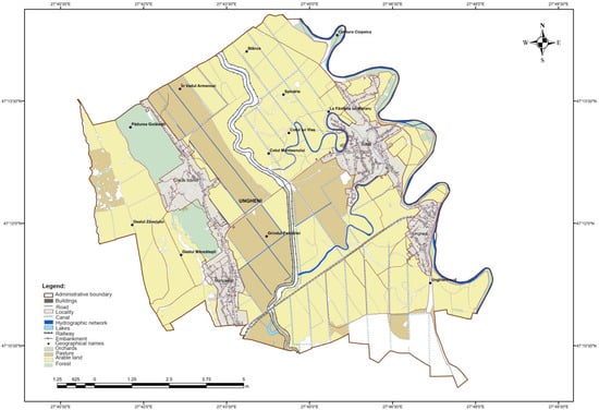 - Land use data represent another important input dataset (see Figure 5). We derived these data from the 2020 color orthophoto plan provided by the National Agency for Cadastre and Land Registration (ANCPI), captured at a scale of 1:5000 and delivered in raster format with a spatial resolution of 50 cm. The data acquisition involved both analog and digital sensors, including the analog ZEISS LMK camera (model RC30) and digital sensors such as the Inertial Measurement Unit (IMU) and Digital Mapping Camera (DMC) with a focal length of 120 mm. Additional ancillary databases from APIA (Agency for Payments and Intervention in Agriculture) were used to support land use classification. These land use data were subsequently employed to estimate surface parameters relevant for hydraulic modeling, such as Manning’s roughness coefficients.