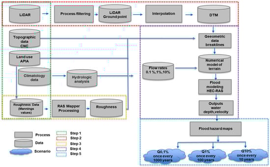 The proposed methodology to produce and analyze flood hazard maps consists of the following five main steps: