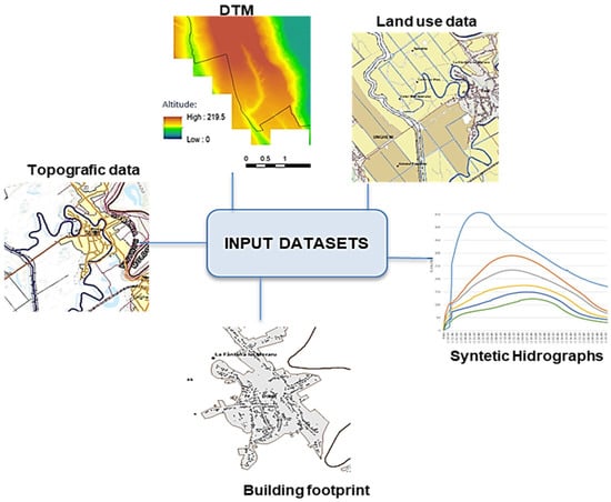 Geospatial layers were collected and processed to facilitate subsequent hydraulic modeling endeavors. The spatial resolution of the computational grid was reduced to optimize computation time and the use of available hardware resources. The choice of resolution does not compromise the model’s ability to reproduce the hydrodynamic processes of interest at the studied scale; rather, it represents a methodological compromise between the accuracy of the results and numerical feasibility [48]. In this study, we use the following data sources.