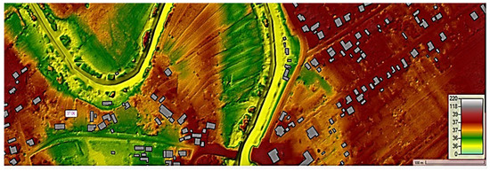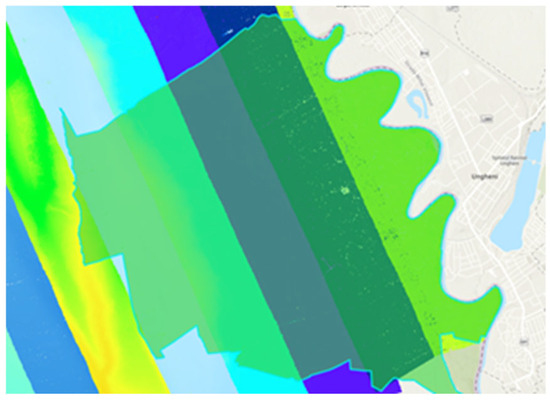 - The main data source for deriving the DTM of the study area is represented by an Airborne Laser Scanning (ALS) dataset acquired in 2012 with the LEICA ALS 70 sensor and a wavelength of 1064 nm, for modeling flood hazard and risk maps in the Prut-Bârlad hydrographic basin according to European Directive 60/2007. These LiDAR data were reused in the present study and specifically processed to obtain the DTM on which the hydraulic model in HEC-RAS was based. The LiDAR strips have an average length of 45 km and a width between 1.5 km and 2.0 km, these specific dimensional parameters being required for precision reasons, taking into account the use of IMU inertial systems. The rectangular plane coordinates were calculated in the WGS84 Universal Transverse Mercator System zone 35N, and the altitudes in the WGS84 ellipsoidal reference system. The spatial resolution of the scan is 1 point/4 m2, and in the overlapping areas between strips, it reaches 1 point/2 m2. The use of airborne LiDAR technology in hydrological and hydraulic modeling is the best option since the altimetric precision is superior to the planimetric precision [49].