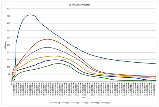 Input hydrographs corresponding to flow rates between 18 and 26 June 2012 with a probability of 20%, 10%, 5%, 2%, 1%, 0.1%.