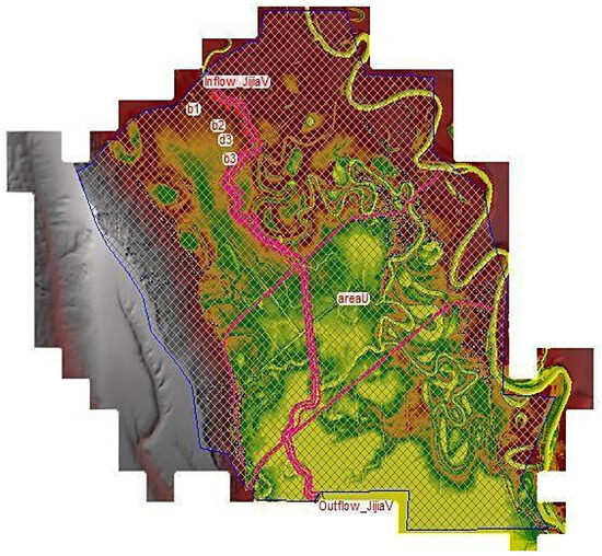 - In this study, we also employed topographic data comprising the river network, road network, railways, and delineation of the study area, as well as defensive structures. We accurately delineated the last using vectorization techniques based on the high-resolution digital terrain model (1 × 1 m), with a vertical accuracy of 10 cm.For computational efficiency, a variable 2D mesh was applied: 2 × 2 m cells for critical features (minor channels, roads, levees) and 8 × 8 m cells in less sensitive floodplain areas. This ensures accurate representation of narrow features while keeping computation times manageable.