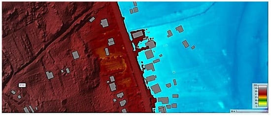 - The building footprint data are sourced from the National Cartography Center (CNC), under the coordination of the National Agency for Cadastre and Land Registration (ANCPI). These georeferenced vector datasets provide accurate building outlines within the study area and are regularly updated to reflect recent urban development. Their integration into hydraulic models enables realistic flood simulations in urban settings and improves flood risk assessments (Figure 4).