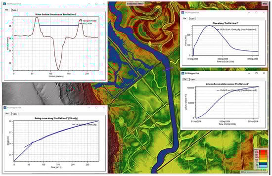 Hydrodynamic modeling can be performed without hydrological modeling. Indeed, suppose synthetic hydrographs with defined probability of exceedance are provided, such as those provided by the certified Institute of Hydrology and Water Management [13]. In that case, it is no longer necessary to simulate rainfall–runoff processes, as these hydrographs can serve directly as input for the upstream boundary conditions in the hydraulic model.
