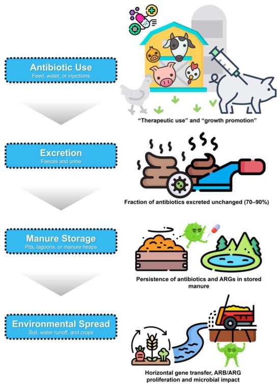 Manure and slurry enriched with antibiotic residues constitutes a critical hotspot for the emergence and dissemination of antimicrobial resistance. Even at sub-inhibitory concentrations, antibiotics exert strong selective pressure on microbial communities, enriching resistant bacteria and resistance determinants. Multiple studies have shown that both land application and controlled incubations of antibiotic-containing manure increase the abundance and diversity of antibiotic resistance genes (ARGs) in soil microbiota []. For example, a survey of soils amended with swine, poultry, or cattle manure—with or without supplementation of the macrolide tylosin—detected 185 unique ARGs, with macrolide–lincosamide–streptogramin B (MLSB) resistance genes dominating. ARG richness and gene copy numbers were significantly higher in manure-amended soils than in unamended controls, with tylosin-spiked manure producing the strongest proliferation. Importantly, elevated ARG levels persisted over time; one study found that soils still contained significantly more ARGs 130 days after manure application than baseline levels. These results underscore that antibiotic-laden manure exerts prolonged resistance pressure, enriching bacteria resistant to tetracyclines, macrolides, aminoglycosides, β-lactams, fluoroquinolones, sulphonamides, and other drug classes commonly present in livestock waste [].