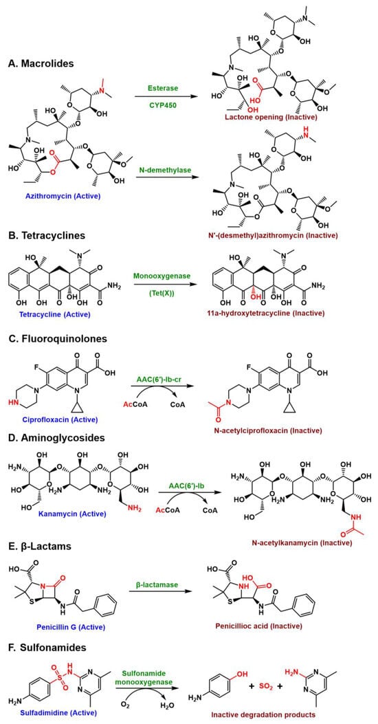 Common enzymatic mechanisms that inactivate antibiotics across different classes. (A) Macrolides—azithromycin is inactivated via esterase-mediated lactone ring hydrolysis or N-demethylation of the desosamine sugar, both disrupting ribosome binding; (B) Tetracyclines—tetracycline is hydroxylated by Tet(X) at C11a, producing unstable, inactive derivatives; (C) Fluoroquinolones—ciprofloxacin is acetylated by AAC(6′)-Ib-cr, reducing binding to DNA gyrase and topoisomerase IV; (D) Aminoglycosides—kanamycin is acetylated, preventing 30S ribosomal subunit interaction; (E) β-Lactams—penicillin G is hydrolyzed by β-lactamases, opening the β-lactam ring and abolishing PBP binding; (F) Sulphonamides—sulfadimidine is oxidised by monooxygenases to inactive products that no longer inhibit dihydropteroate synthase.