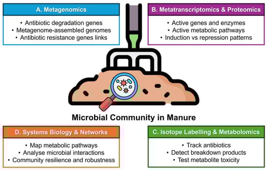 The degradation of antibiotics in manure is largely governed by indigenous microbiota originating from the animal gut and the surrounding environment. These communities possess diverse metabolic functions, enabling both direct enzymatic breakdown and co-metabolic transformations that yield fewer active metabolites, epimerised derivatives, or complete mineralisation products. Degradation efficiency differs across antibiotic classes, with β-lactams rapidly hydrolysed by microbial β-lactamases, while structurally complex fluoroquinolones and macrolides often persist due to their aromatic or macrocyclic scaffolds [,]. Metagenomic surveys reveal that manure microbiomes not only exhibit broad taxonomic diversity but also encode oxidoreductases, hydrolases, and transferases involved in antibiotic transformation []. However, these same communities can also serve as reservoirs of antibiotic resistance genes (ARGs), creating a paradox where biodegradation and resistance dissemination occur simultaneously. Moreover, while microbial degradation reduces the immediate load of active antibiotics, incomplete transformation can generate stable byproducts that leach into soils and waters, posing risks of downstream contamination. Thus, understanding microbial community dynamics is essential not only for predicting antibiotic fate in manure but also for safeguarding water environments from both residues and their degradation products.