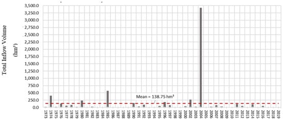 This exceptionality that occurred in this period can also be confirmed with the data presented in Figure 5, which shows the historical records, from 1973 to 2019, of the total inflow volume at Jaguaribe River, in January and February.