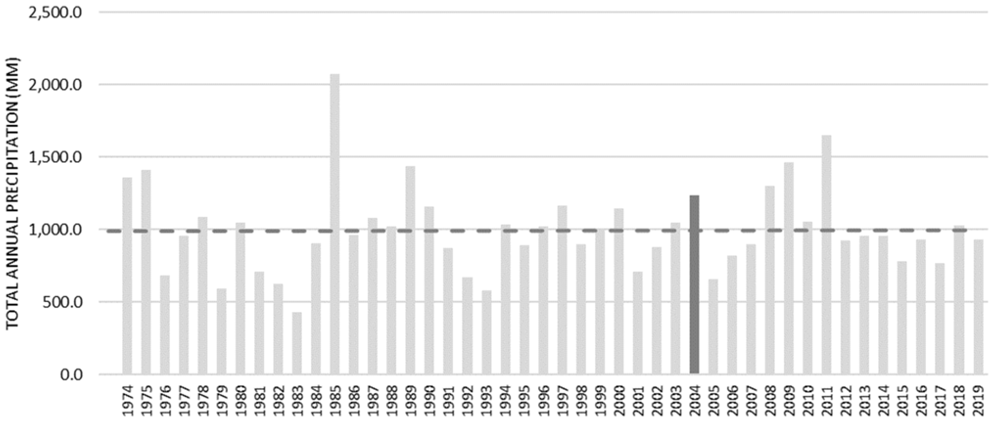 3.1. Hydrological and Climatic Context of the 2004 Flood Event