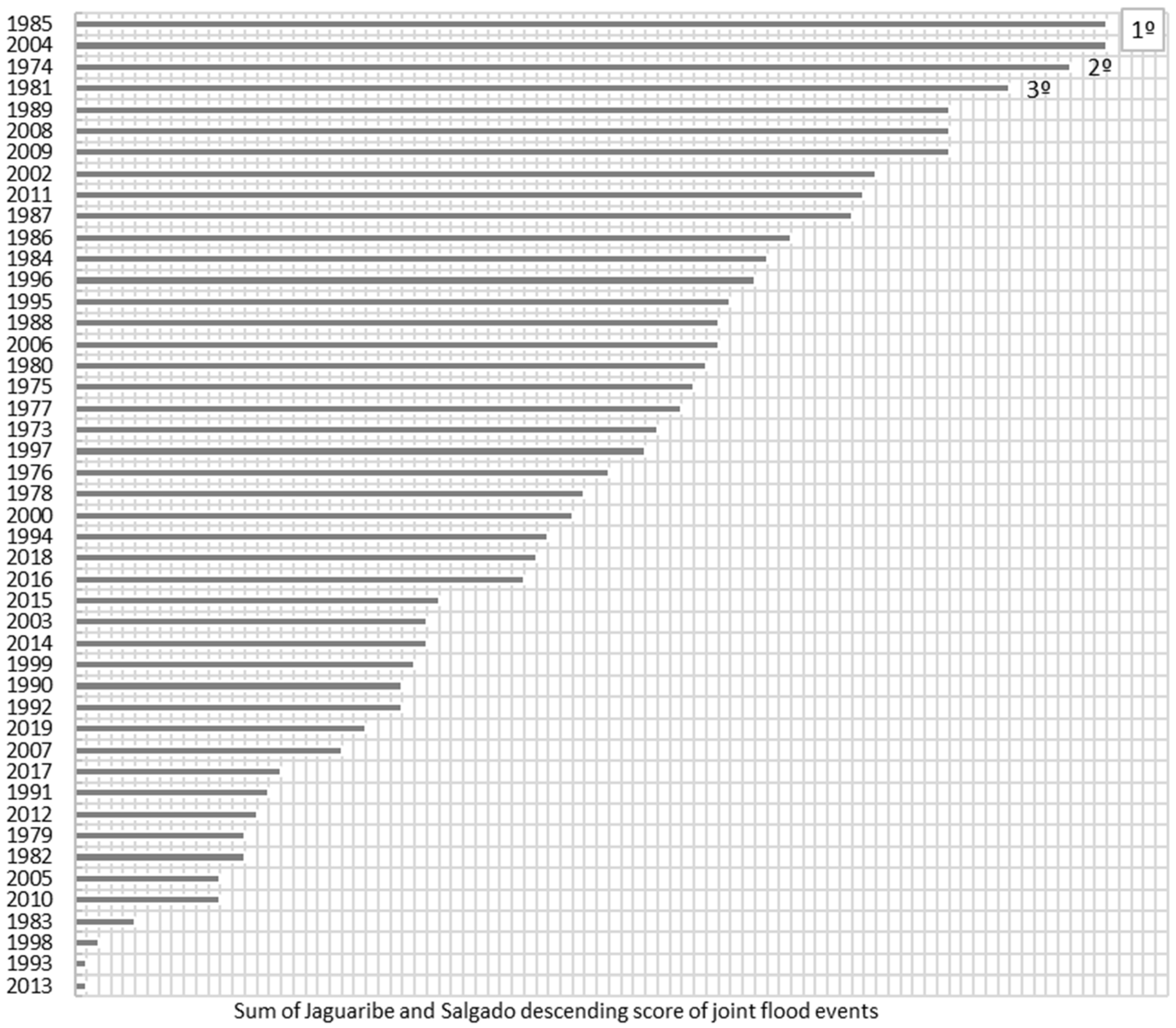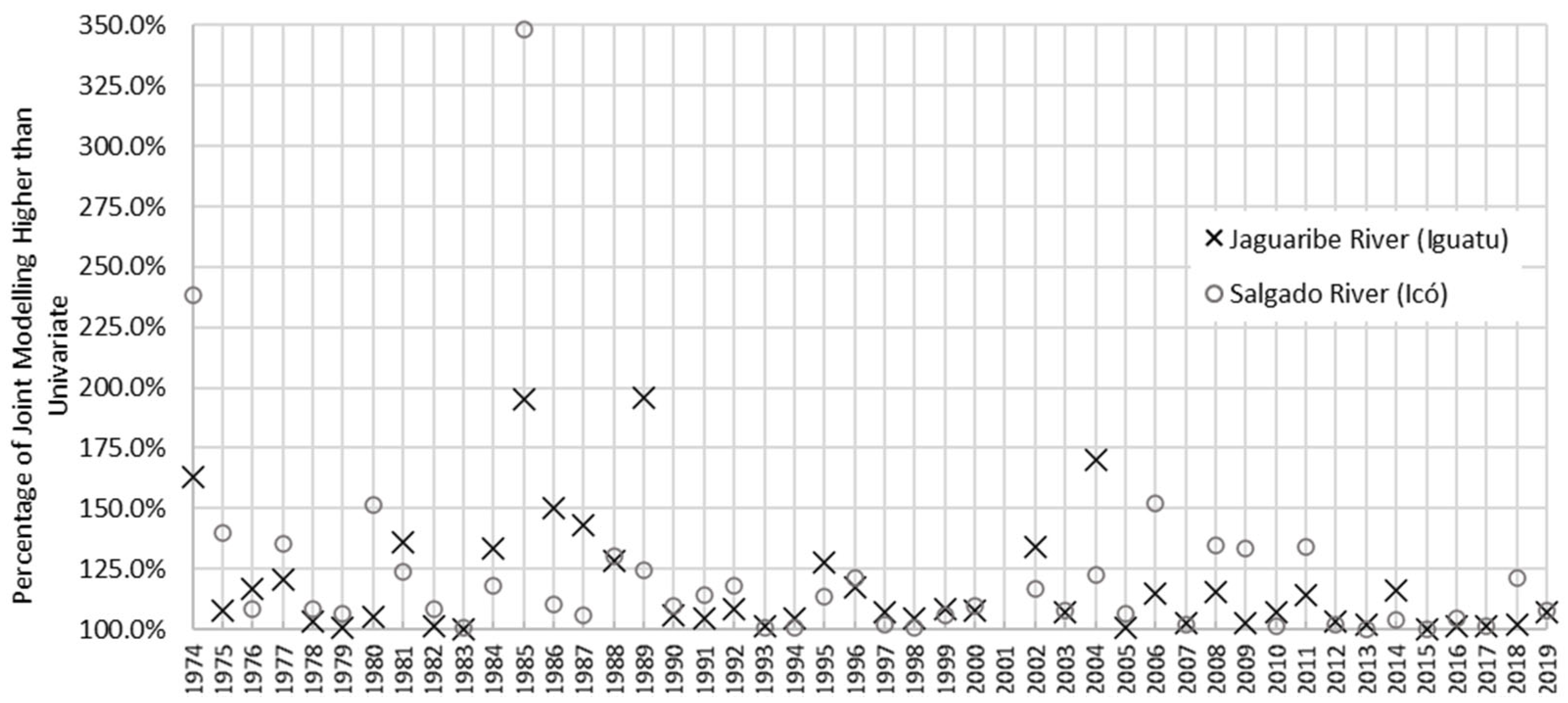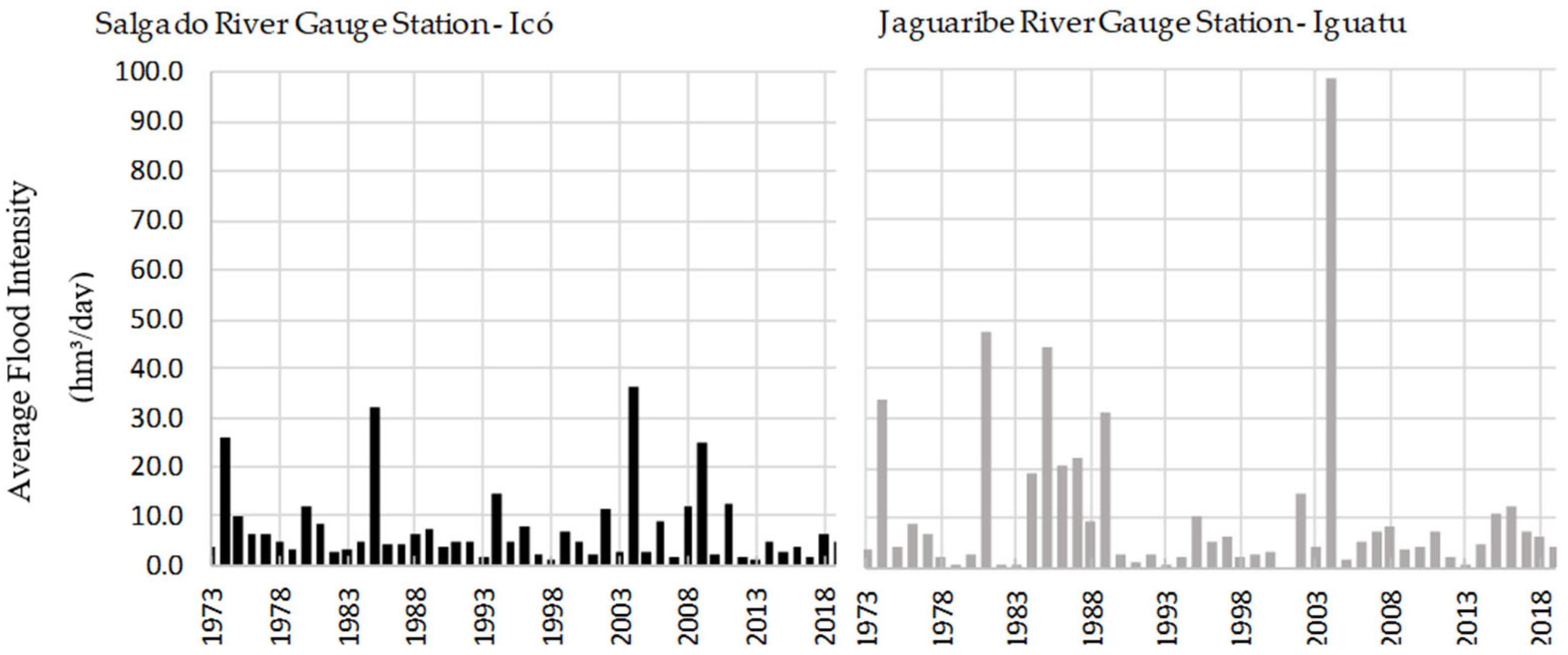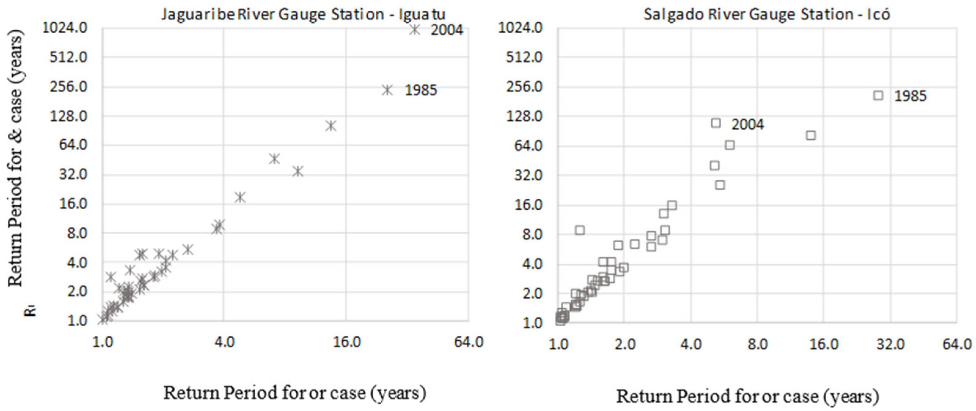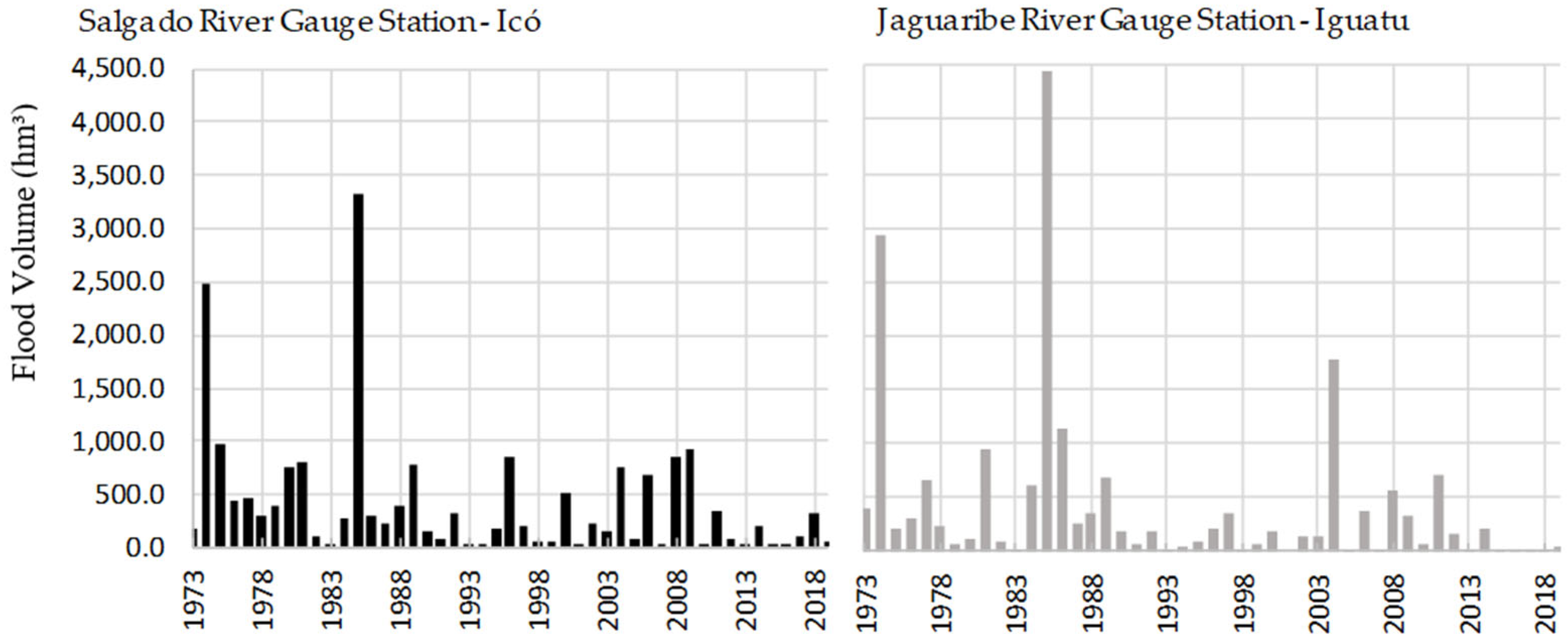 Event Year | Jaguaribe River Gauge Station—Iguatu | Salgado River Gauge Station—Icó | ||||||