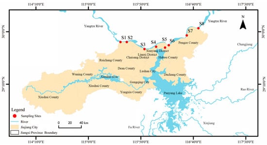 Water sampling was conducted in the Jiujiang Port area in August (wet season) and October (dry season) of 2024. The distribution of sampling sites is shown in Figure 1. The sampling sites are situated within, or immediately downstream of, major agricultural zones. Specifically, the central part of the study area (encompassing sites S4, S5, and S6) is dominated by a ‘rice–rice–rapeseed’ triple-cropping system, while the eastern and western regions also contain significant tracts of farmland dedicated to cotton, soybean, and vegetable production. This land use pattern is a primary factor in the release of pesticides into local water bodies via surface runoff. Samples were collected from a constant water layer 50 cm below the surface using a Plexiglass water sampler. To minimize photodegradation, water samples were immediately transferred into 4 L brown glass bottles after collection. All samples were stored in the dark at 4 °C to preserve their integrity and minimize environmental disturbance, and subsequent processing was strictly completed within 72 h. After standing for layer separation, the supernatant was extracted using a siphon method and filtered under negative pressure through 0.7 μm glass fiber filters to remove suspended particles. Subsequently, appropriate pretreatment methods were applied according to the physicochemical properties of different categories of pesticides, to ensure that satisfactory amounts of the target pollutants were recovered.