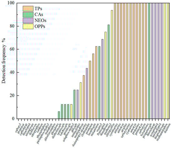 A total of 49 pesticides were detected across eight sampling sites in the Jiujiang Port area, including 15 triazine pesticides, 11 carbamate pesticides, 9 neonicotinoid pesticides, and 14 organophosphorus pesticides. The detection rates for different pesticide categories are shown in Figure 2. Twenty pesticides had detection rates ≥ 80%, among which eighteen were detected at all sites (100% detection rate). These include cyromazine, simazine, simetryn, atrazine, terbuthylazine, cyanazine, ametryn, propazine, prometryn, terbutryn, and hexazinone (TPs), propamocarb (CAs), dinotefuran, acetamiprid, imidacloprid, and thiamethoxam (NEOs), and methamidophos and diazinon (OPPs). The widespread detection of these pesticides indicates their extensive use and persistence in the study area.