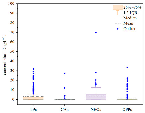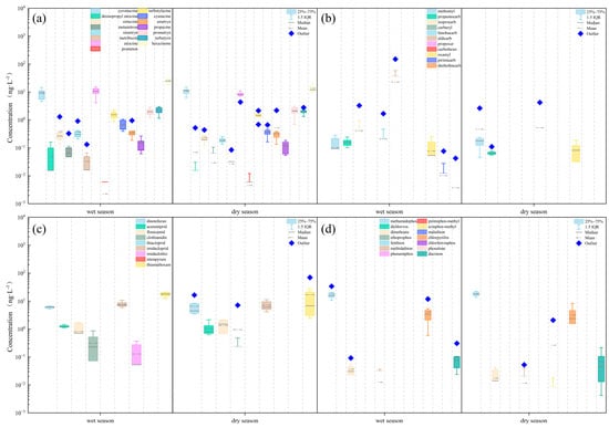 The concentration distributions of the four pesticide categories are illustrated in Figure 3. The concentration ranges were 0–31.897 ng·L−1 (mean: 3.063 ng·L−1; median: 0.359 ng·L−1) for TPs, 0–27.284 ng·L−1 (mean: 0.321 ng·L−1; median: 0 ng·L−1) for CAs, 0–69.952 ng·L−1 (mean: 3.752 ng·L−1; median: 0.794 ng·L−1) for NEOs, and 0–33.573 ng·L−1 (mean: 1.554 ng·L−1; median: 0 ng·L−1) for OPPs. Among the samples collected during both wet and dry seasons, hexazinone and cyromazine showed the highest mean concentrations in TPs, at 19.209 ng·L−1 and 9.825 ng·L−1, respectively. For CAs, aldicarb and methomyl had the highest mean concentrations, at 2.993 ng·L−1 and 0.259 ng·L−1, respectively. In NEOs, thiamethoxam and imidacloprid exhibited the highest mean concentrations, reaching 17.123 ng·L−1 and 7.403 ng·L−1, respectively. Among OPPs, methamidophos and chlorpyrifos were detected at the highest mean concentrations, measuring 17.850 ng·L−1 and 3.656 ng·L−1, respectively.