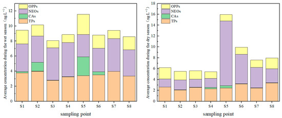 The concentrations of pesticides detected in the Jiujiang Port basin exhibited notable spatiotemporal variations, as shown in Figure 4. During the wet season, the average concentrations of the pesticide categories, in descending order, were as follows: NEOs (3.749 ng·L−1) > TPs (3.500 ng·L−1) > OPPs (1.571 ng·L−1) > CAs (0.537 ng·L−1). In the dry season, the order was as follows: NEOs (3.755 ng·L−1) > TPs (2.625 ng·L−1) > OPPs (1.538 ng·L−1) > CAs (0.104 ng·L−1). Overall, the pollution levels were slightly higher in the wet season than in the dry season.