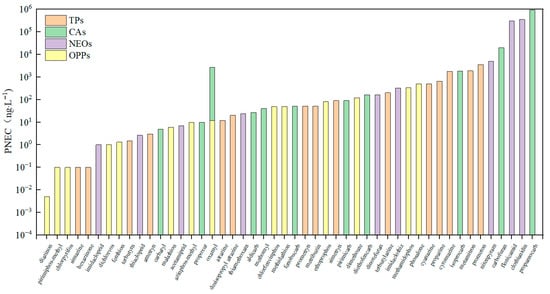 The PNEC values for 49 pesticides were derived from the ECOTOX database or ECOSAR model predictions. Chronic toxicity data for the most sensitive species were selected, with priority given to the NOEC or EC10. If these were unavailable, the LOEC or EC50 was used. As shown in Figure 6, propamocarb had the highest PNEC value (920,000 ng·L−1), while diazinon had the lowest (0.005 ng·L−1). Ten pesticides exhibited PNEC values exceeding 1000 ng·L−1: cyromazine, isoprocarb, metamitron, oxamyl, prometon, nitenpyram, carbofuran, flonicamid, clothianidin, and propamocarb.