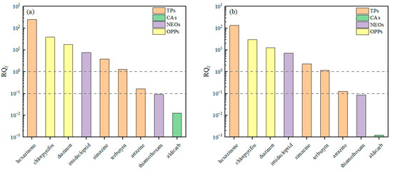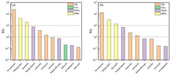 RQ values for pesticides: (a) wet season, (b) dry season.