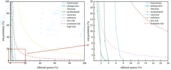 JPCs were developed for six high-risk pesticides—hexazinone, chlorpyrifos, diazinon, imidacloprid, simazine, and terbutryn—to assess their ecological risks probabilistically (Figure 9). The maximum risk product (RP) for hexazinone was 3.29%, resulting in 0.3–6% of species being subject to moderate risk. Chlorpyrifos, imidacloprid, and terbutryn exhibited low risk, with maximum RP values of 0.25%, 1.40%, and 0.59%, respectively. Diazinon and simazine posed negligible risk. Compared to the RQf method, the JPC approach integrates toxicity data from multiple species and trophic levels, reducing assessment uncertainty through species sensitivity distributions and avoiding the over- or underestimation of risk based on the most sensitive endpoints. For instance, while diazinon was identified as high-risk using the RQf method (RQfmax = 18.13), the JPC evaluation indicated negligible overall risk (RP = 0.02%), suggesting that its high sensitivity in certain species does not translate to significant community-level risk. The JPC method offers greater ecological relevance for assessing contaminants with strong bioaccumulation potential and wide migration ranges, thereby providing a more scientifically robust basis for risk management decisions.