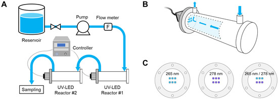 - Keshavarzfathy, M.; Hosoi, Y.; Oguma, K.; Taghipour, F. Experimental and computational evaluation of a flow-through UV-LED reactor for MS2 and adenovirus inactivation. Chem. Eng. J. 2021, 407, 127058. [Google Scholar] [CrossRef]