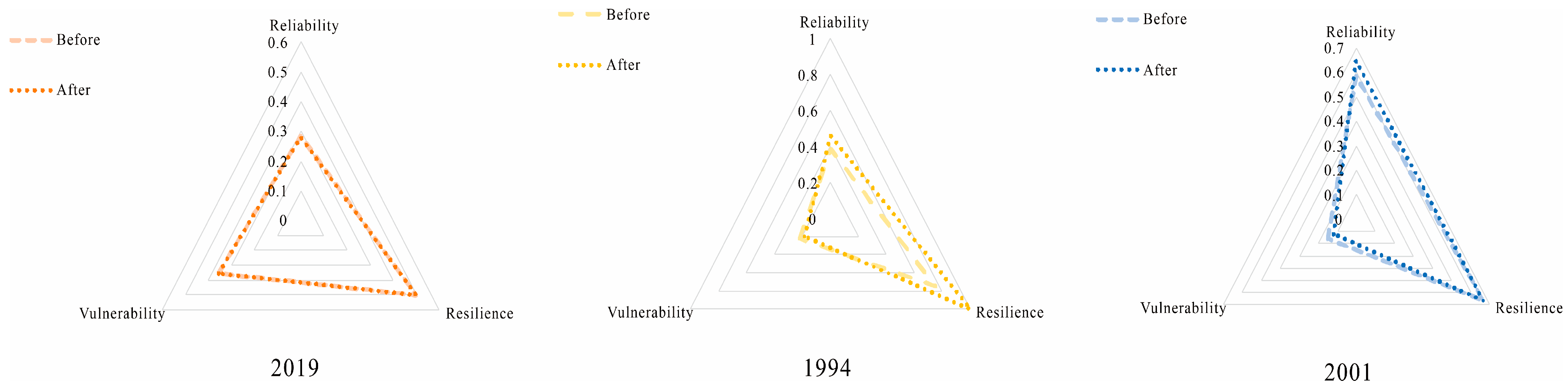 - Asefa, T.; Clayton, J.; Adams, A.; Anderson, D. Performance evaluation of a water resources system under varying climatic conditions: Reliability, Resilience, Vulnerability and beyond. J. Hydrol. 2014, 508, 53–65. [Google Scholar] [CrossRef]