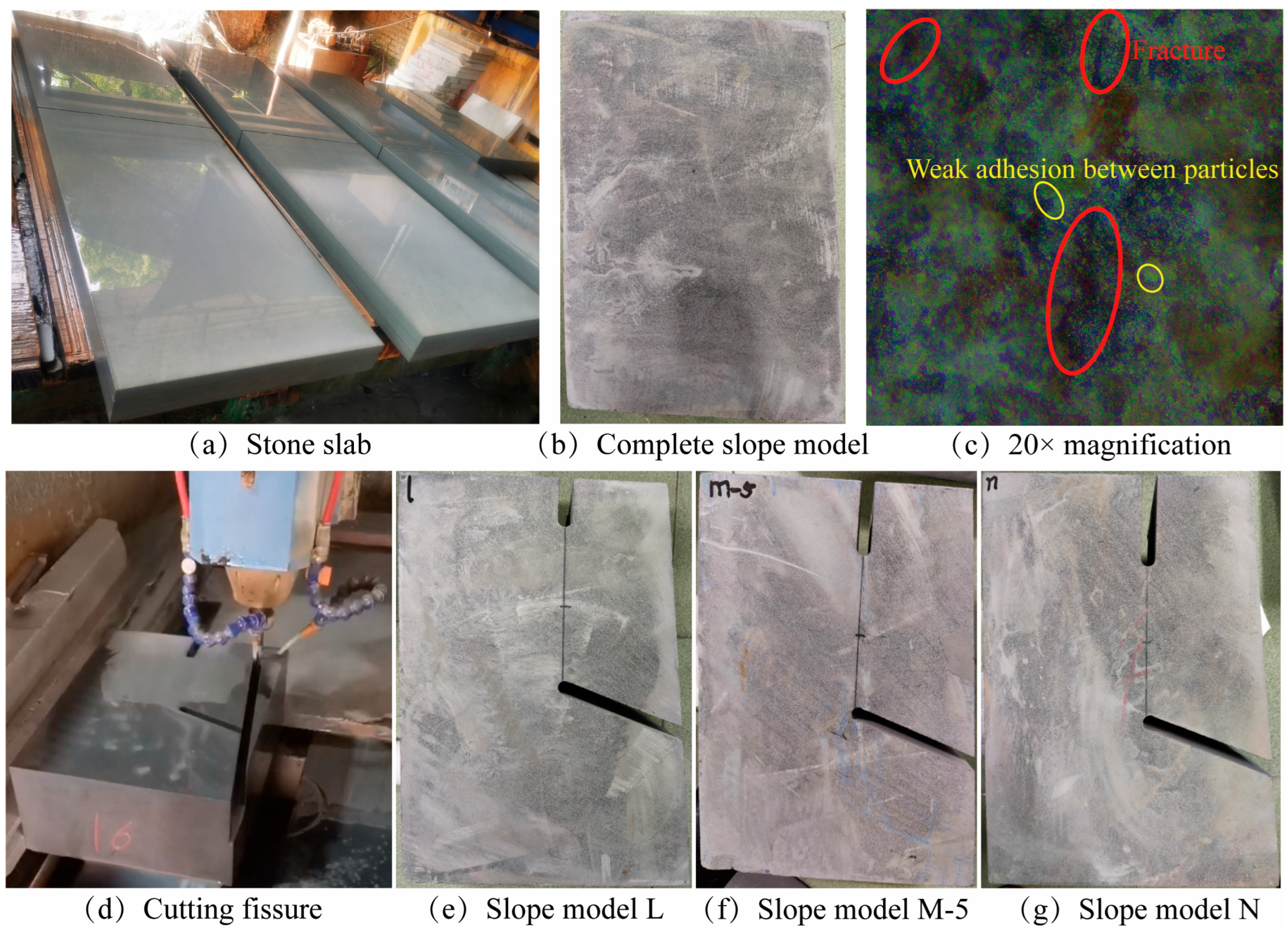 After an on-site investigation, this study took a rock slope with a three-section landslide in the Mila Mountain area as the case study. The generalized model of the slope is shown in Figure 1. The gray sandstone formations on the 20 m-high slopes are all carved to an angle of 80°. Based on geometric similarity [29], the model was made at a scale of 1:50. A scale model of rock slopes with a three-section landslide was made using boulders of gray sandstone gathered from the base of the slope, as shown in Figure 2. The trailing edge tension crack length of the model is L 1 . The angle ( α 3 ) between the leading edge shear crack ( L 3 ) and the horizontal line is 20°, and the locking sections of each model are equal in length. The gray sandstone is rather firmly cemented, with different particle sizes and forms, as shown in Figure 2c. The quartz particle content is relatively high, whereas the clay mineral content is very low. Some particles have poor bonding, and natural microcracks of variable lengths exist (Table 1).