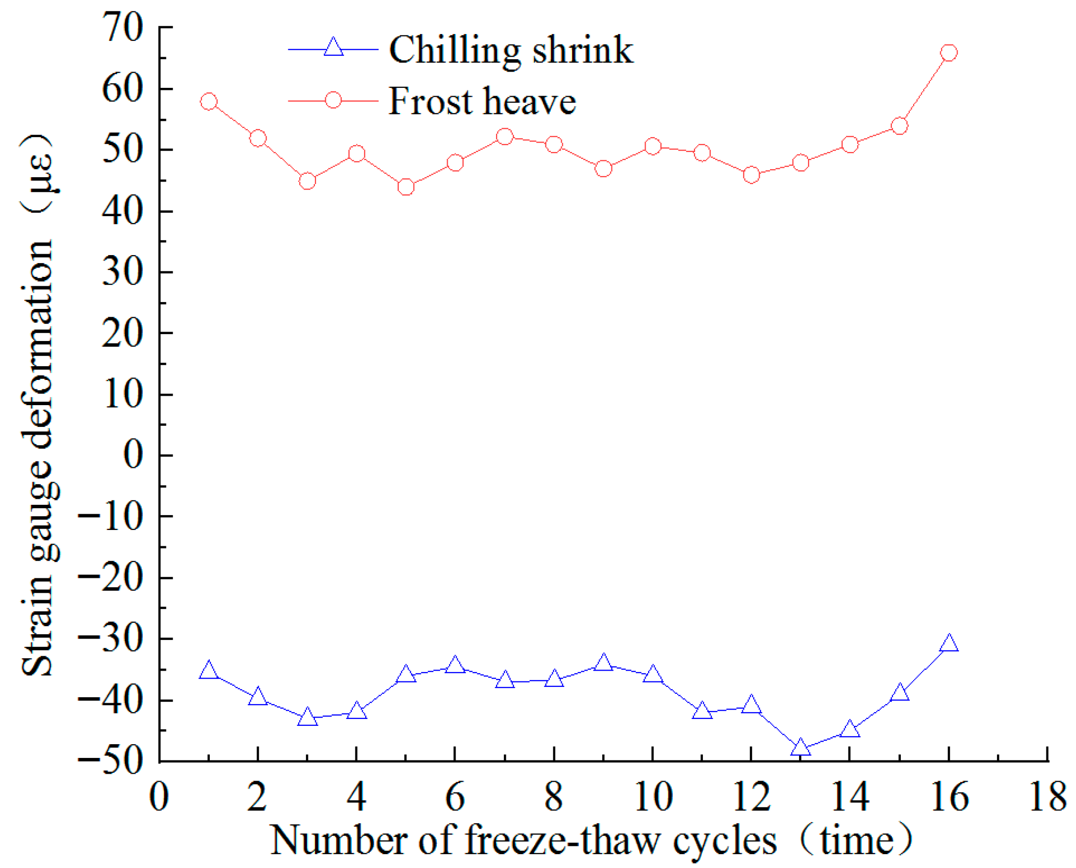 To acquire strain gauge deformation results at 60 mm below the slope top, a complete gray sandstone slope model was tested under double-sided freeze–thaw (from −20 °C to 20 °C). Figure 7 displays the maximum values of chilling shrink and frost heave deformation for the intact sample K-2. The maximum value of frost heave no longer exceeded 70 με, whereas the maximum value of chilling shrink was no larger than 50 με. Noticeably, the sample was very slightly deformed after 16 freeze–thaw cycles. According to literature analysis, intact rock slopes can cause rock degradation and geological disasters during long-term freeze–thaw cycles (including annual and century cycles) [30,31,32].