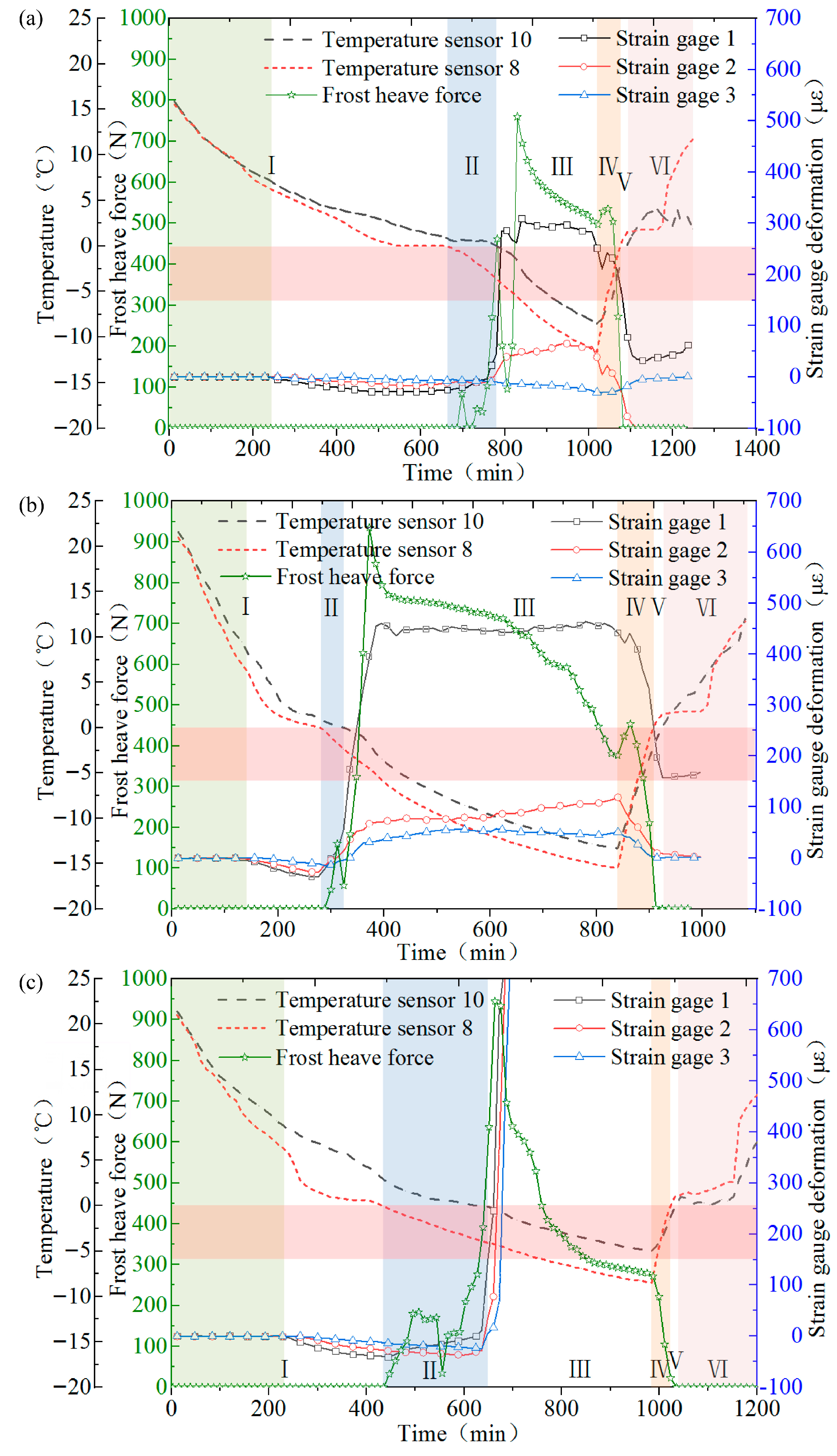 In early stage II, the open end of the crack was frozen and sealed, and crack water gradually froze from the top down, corresponding to temperature variations. The frost heave force was rather minimal at this time, with the strain gauges 1, 2, and 3 progressively shifting from chilling shrink to frost heave state. Frost heave occurred initially in gauge 1 and finally in gauge 3. In the early stages of freezing, the adhesive force was relatively weak between the ice wedge at the top of the crack and the crack wall, which was not tightly restricted. The frost heave force squeezed the ice wedge upward, causing a decrease in the frost heave force.
