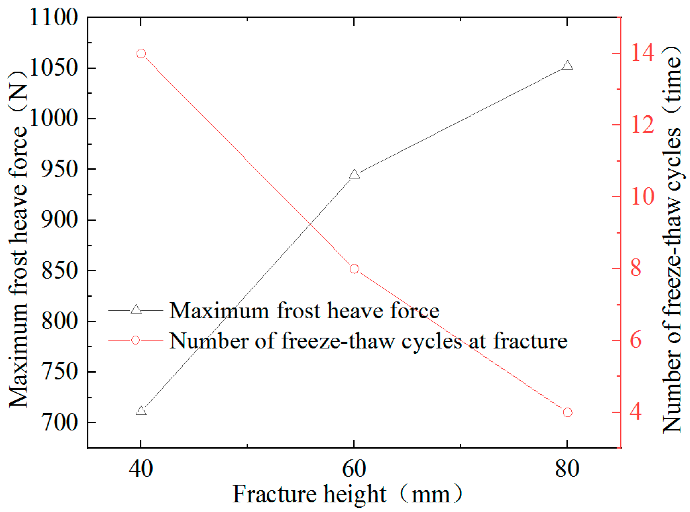 The freeze–thaw damage process of the trailing edge tensile fractures in a “three-stage” slope is related to the temperature variation trend of the fracture water. The key variations are as follows: the volumes of crack water and ice wedges generated increase with the depth of the tensile crack at the trailing edge. The migration of unfrozen water toward the ice wedge is more significant the greater the temperature difference between the top and bottom of the fracture. Figure 10 demonstrates the maximum frost heave force of a three-section slope model with different crack depths. Noticeably, the frost heave force increases with the depth of the crack. The maximum frost heave force increases by 233 N as the tensile crack at the trailing edge increases from 40 mm to 60 mm. In contrast, the maximum frost heave force only increases by 107 N as the tensile crack at the trailing edge increased from 60 mm to 80 mm. The tensile cracks at the 40 mm, 60 mm, and 80 mm trailing edges were fractured and destroyed in the locking section after 14, 8, and 4 freeze–thaw cycles, respectively. Noticeably, the fracture failure of the locking section accelerates as the tensile crack length increases at the trailing edge of the slope.