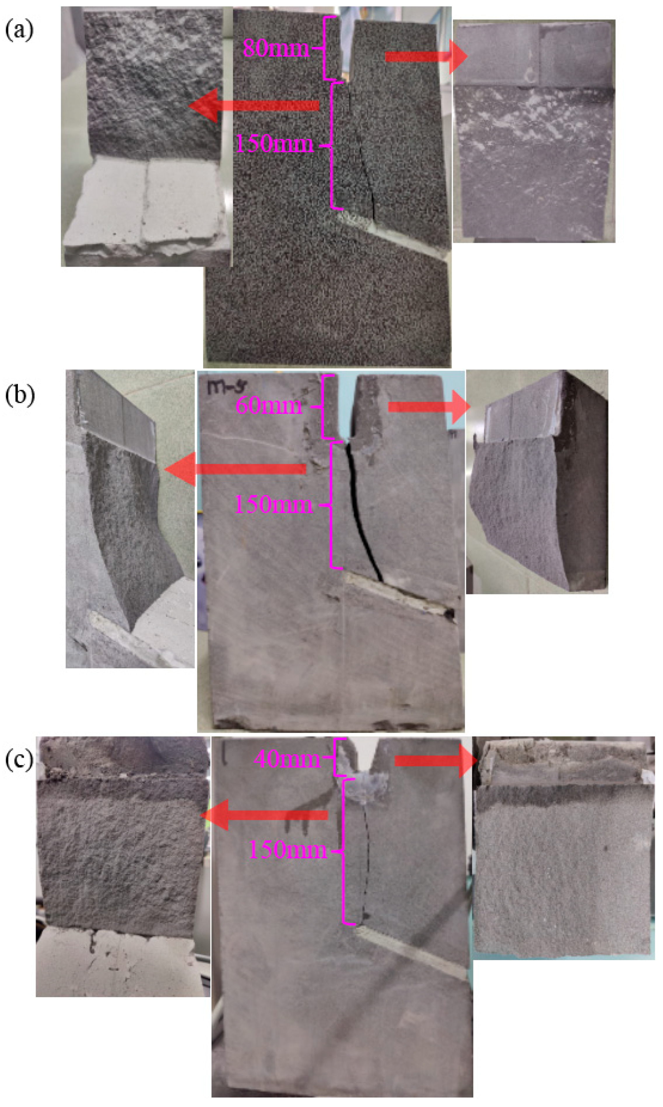 The freeze–thaw failure morphology of the three-section slope model with different crack depths is shown in Figure 11. Figure 12 depicts the propagation of cracks from the fracture at the bottom of the cracks. The fracture cracks extend downward along the direction of tensile cracks at the trailing edge until they intersect with shear cracks at the leading edge. The flatness and lack of shear marks on the fracture surface can be attributed to the tensile failure induced by frost heave. The direction of tensile cracks at the trailing edge is consistent with that of frost heave cracks based on the analysis of the on-site research findings of rock slopes with a three-section landslide. The larger the length and width of tensile cracks at the trailing edge, the stronger the water catchment and conductivity of the cracks, and the more severe the impact of freeze–thaw weathering.