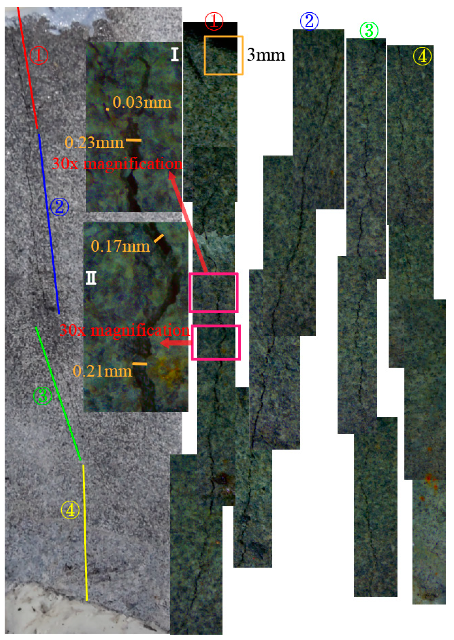 Microscopic imaging was performed on the fracture cracks of Model M-5 after eight freeze–thaw failures, as shown in Figure 13. The crack in sections ① and ② is the widest, ranging from 0.17 mm to 0.23 mm. A 30-fold enlargement of the two cracks in section ① reveals that the main crack has a large local curvature, accompanied by small dendritic cracks (0.03 mm) on both sides. The crack morphology mainly comprises an intergranular fracture and rarely a transgranular fracture, which is consistent with previously described tensile failure characteristics (tensile failure mainly manifests as an intergranular fracture). The crack width in section ③ is similar to that in ① and ②, and that in section ④ is the smallest. As the number of freeze–thaw cycles increases, the deterioration length of the trailing edge tensile crack increases and the effective length of the locking section decreases, as does the integrity and stability of the slope.