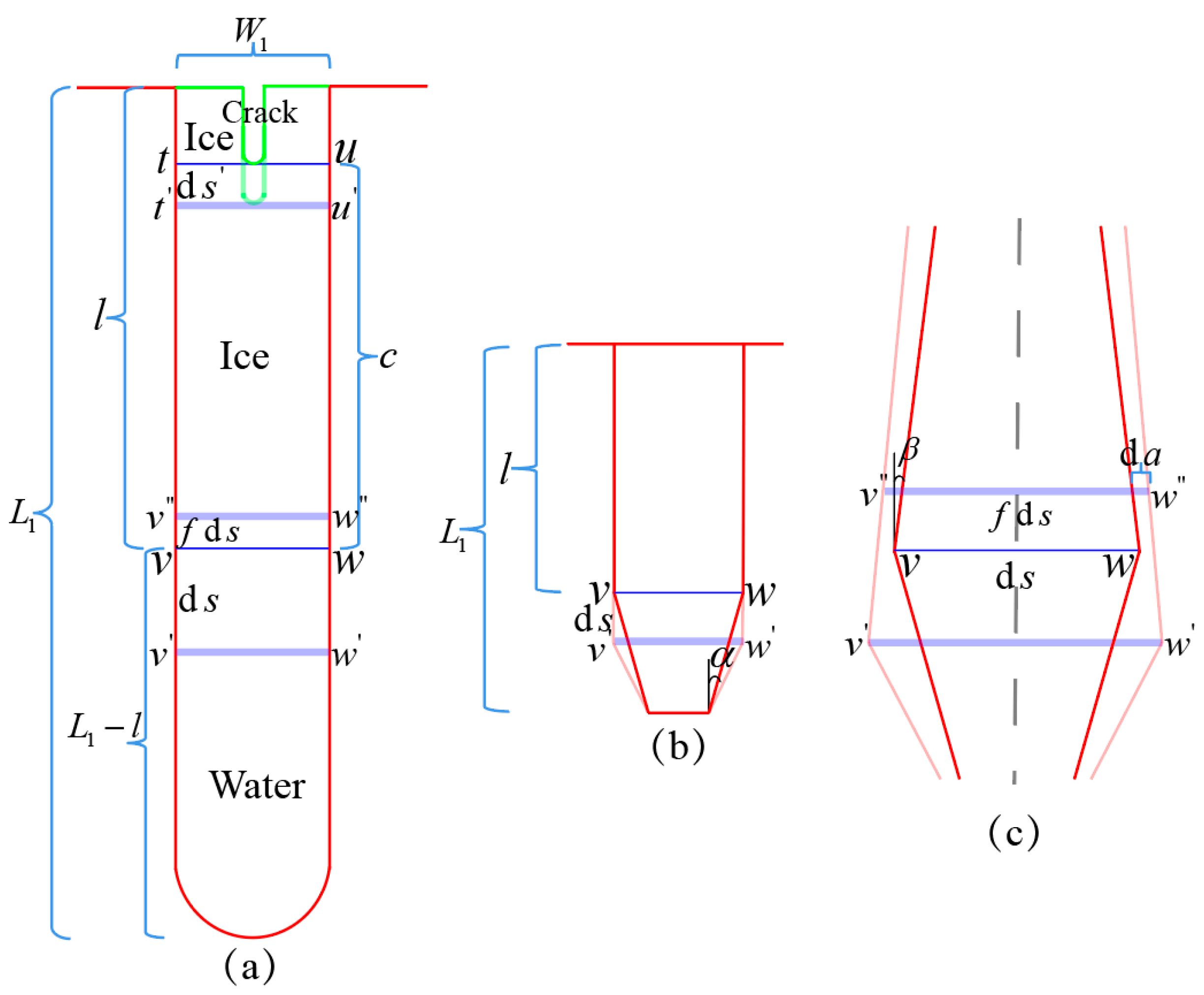 For simplicity, the bottom of the crack is considered flat and parallel to v w , and the crack wall is bent inward by an angle α , as illustrated in Figure 14b. The squeezing of the ice jam is thus ignored at this point, and the angle α is calculated based on mass conservation. The ice mass in length d s plus the water mass in the expansion volume below v w equals the water mass in length d s . For the unit length perpendicular to the graph, which is ρ w α ( L 1 l ) d s , the following equation can be obtained: