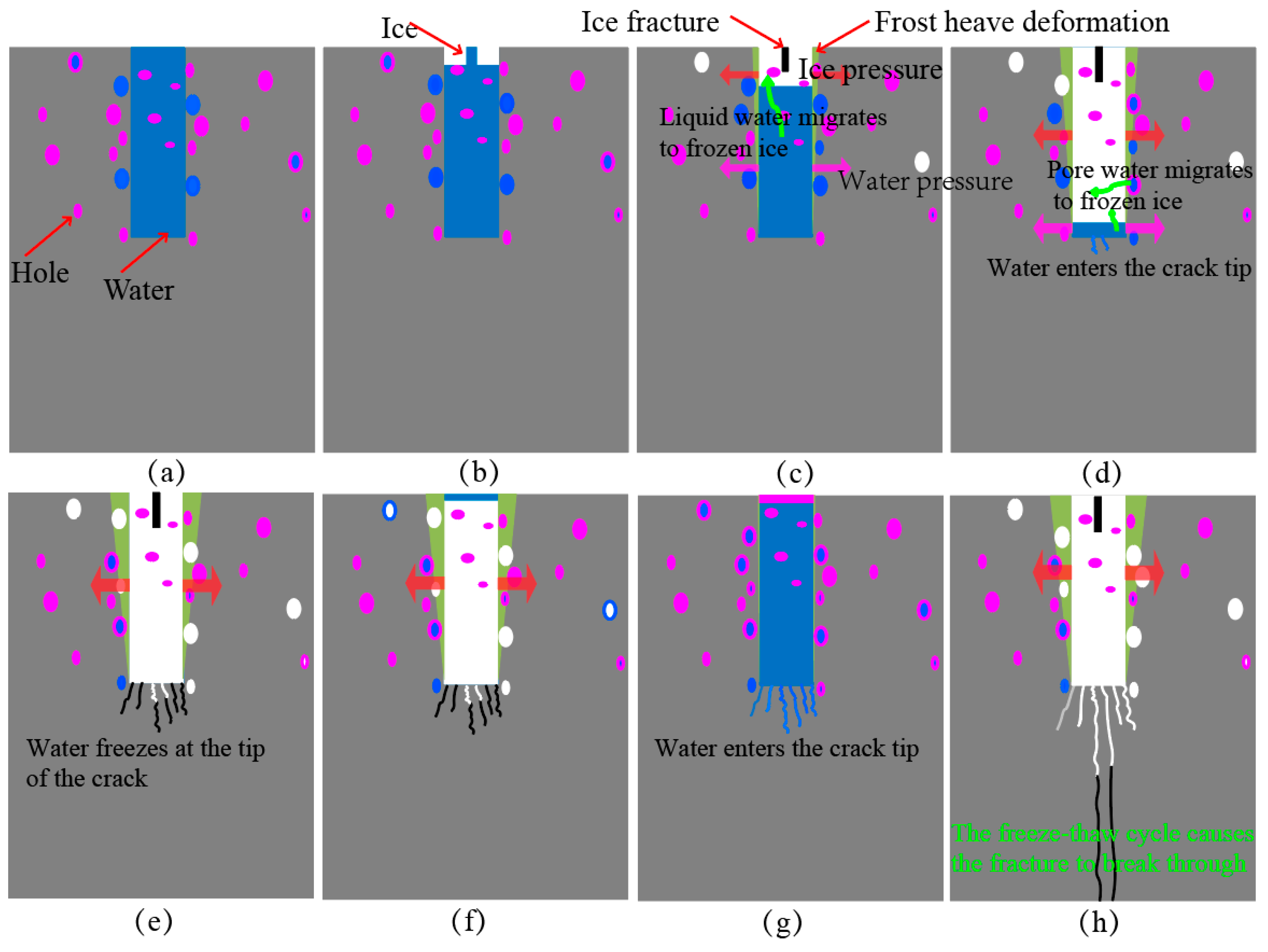 Figure 16. Schematic of the freeze–thaw mechanism of tensile cracks at the trailing edge (local and non-proportional expansion to depict the microelements): (a) Injecting water into cracks to cool down; (b) liquid water freezes at the top of the crack; (c) the ice at the top of the crack is squeezed out; (d) the freezing front advances downwards; (e) all water in the cracks freezes; (f) melting water at the top of the crack freezes again; (g) ice wedge melts completely; (h) fractures occur after freeze–thaw cycles.